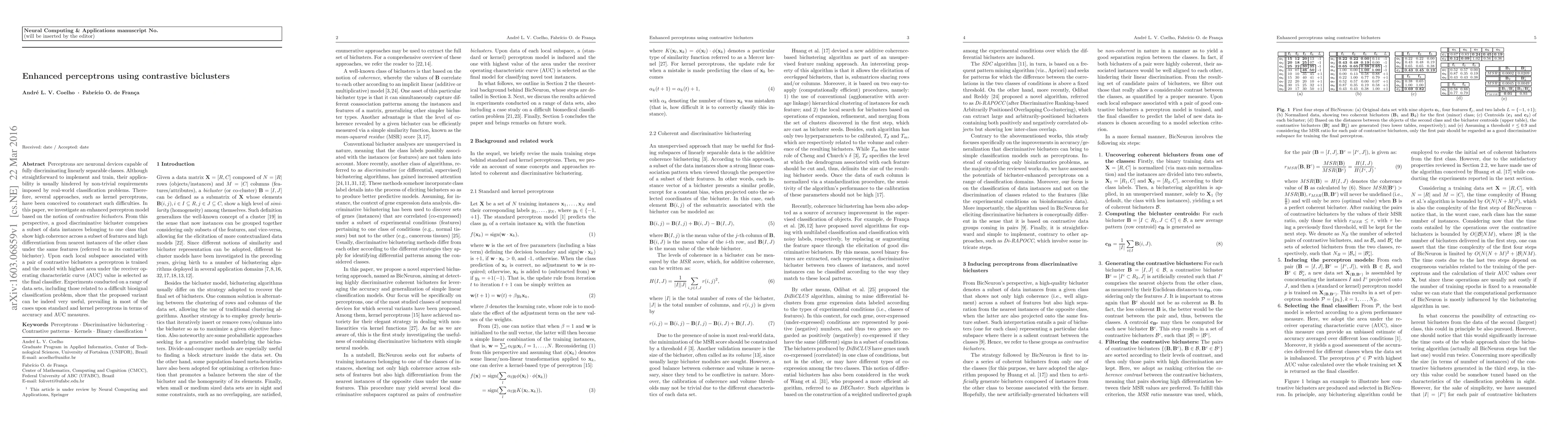 This paper proposes an enhanced perceptron model utilizing contrastive biclusters to improve classification accuracy. It trains perceptrons on local subspaces defined by coherent and contrasting biclusters, selecting the best-performing model based on AUC. Experiments demonstrate superior performance over standard and kernel perceptrons across various datasets.