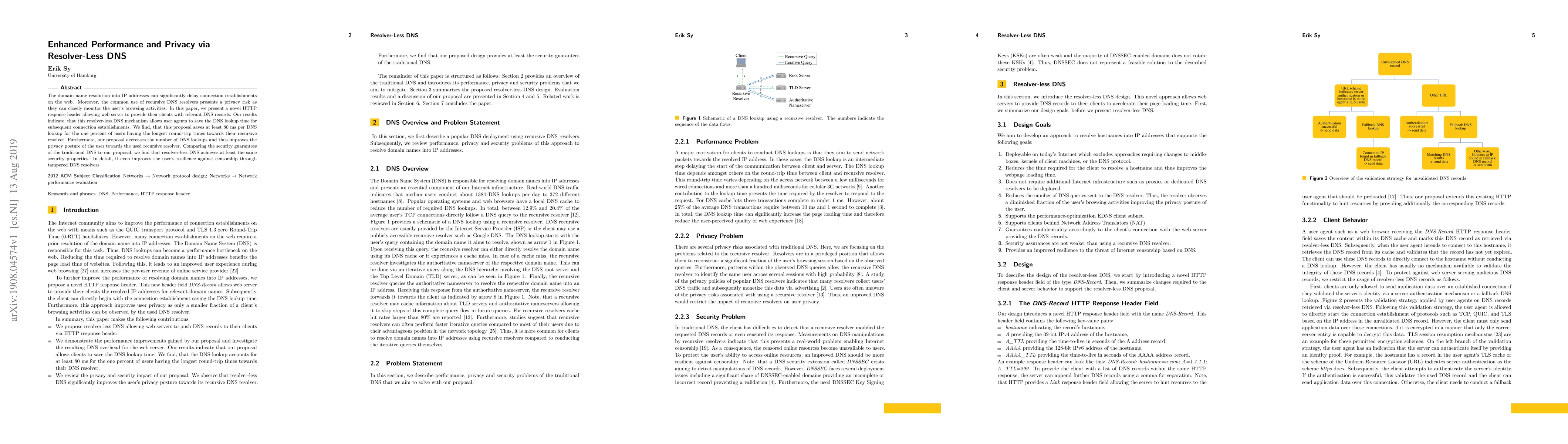 This paper proposes a resolver-less DNS mechanism using an HTTP header to provide DNS records directly from web servers, reducing lookup time by at least 80ms for users with long round-trip times. It also enhances privacy by minimizing DNS lookups and maintains equivalent security guarantees compared to traditional DNS.