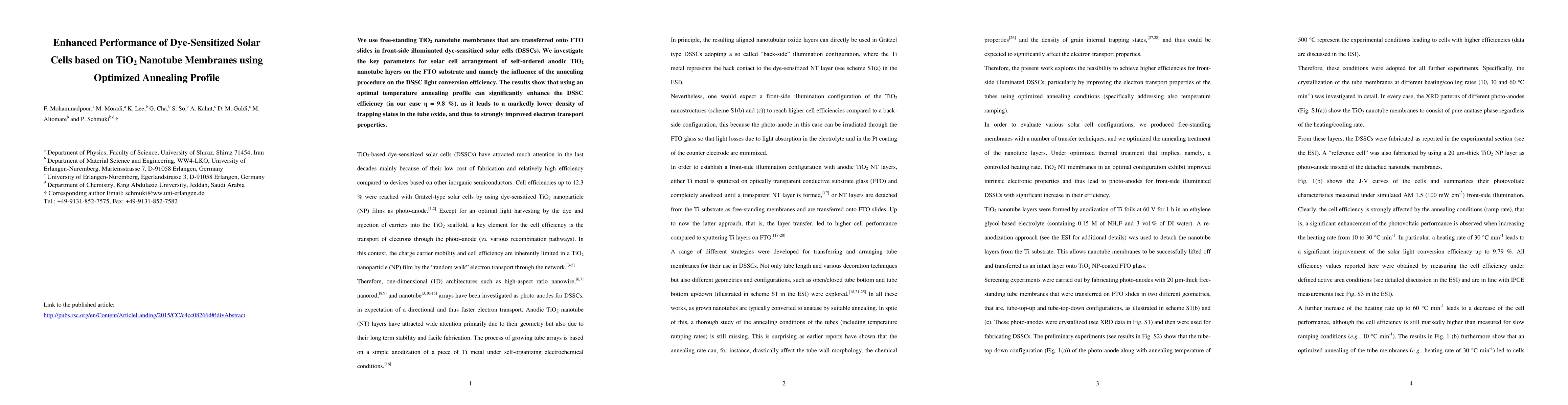 This study explores the impact of optimized annealing profiles on the performance of dye-sensitized solar cells (DSSCs) using free-standing TiO2 nanotube membranes. The research finds that an optimal annealing temperature significantly enhances DSSC efficiency by reducing trapping states and improving electron transport, achieving a conversion efficiency of 9.8%.