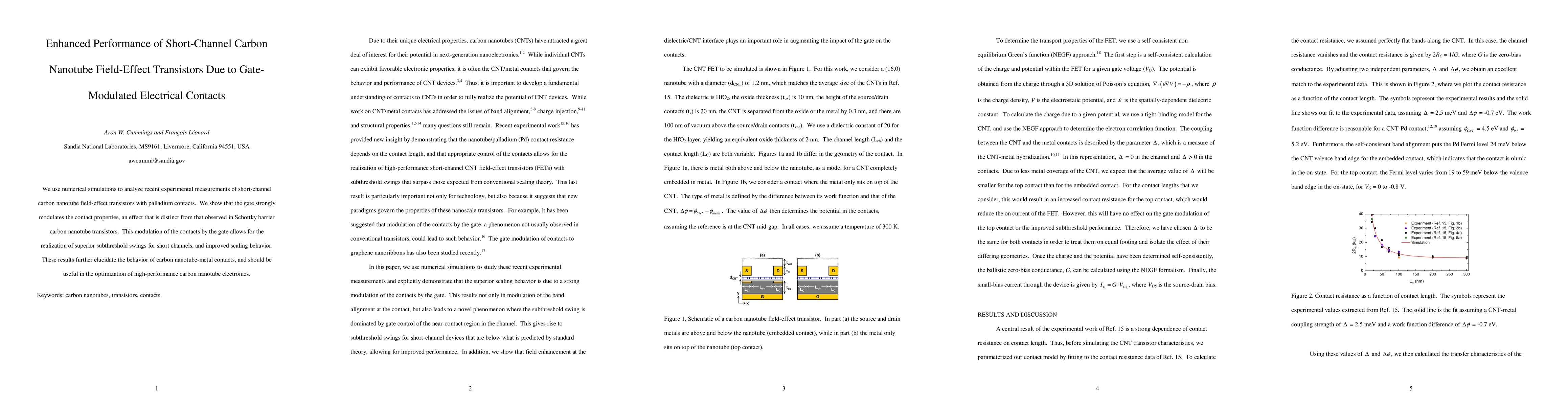 This study demonstrates, through numerical simulations, that gate modulation significantly enhances the electrical contact properties in short-channel carbon nanotube field-effect transistors with palladium contacts, leading to superior subthreshold swings and improved scaling behavior compared to traditional Schottky barrier contacts. These findings provide insights into optimizing high-performance carbon nanotube electronics.
