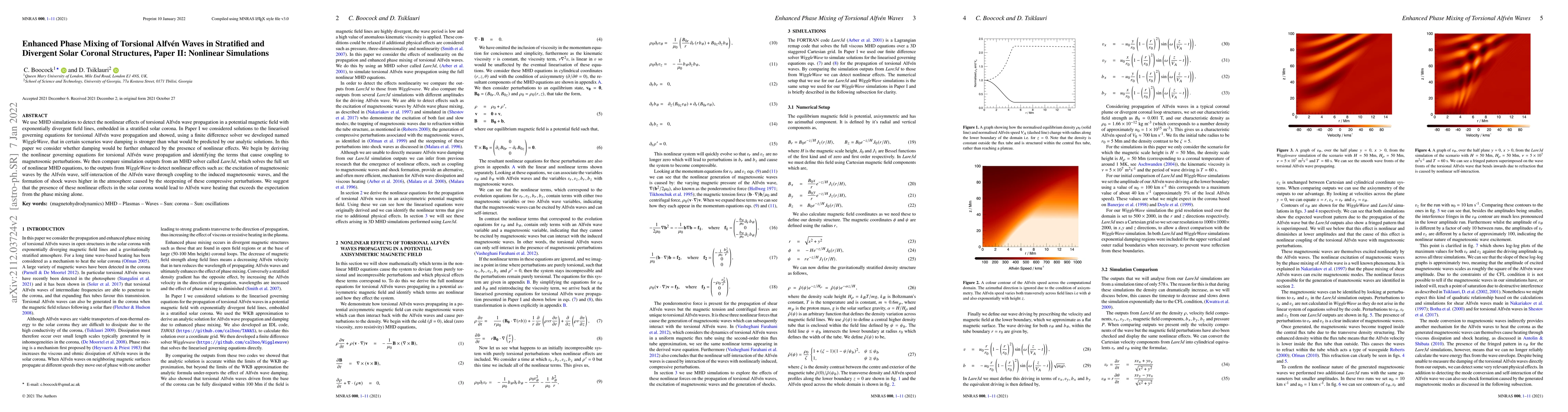 We use MHD simulations to detect the nonlinear effects of torsional Alfv\'en wave propagation in a potential magnetic field with exponentially divergent field lines, embedded in a stratified solar corona. In Paper I we considered solutions to the linearised governing equations torsional Alfv\'en wave propagation and showed, using a finite difference solver we developed named WiggleWave, that in certain scenarios wave damping is stronger than what would be predicted by our analytic solutions. In this paper we consider whether damping would be further enhanced by the presence of nonlinear effects. We begin by deriving the nonlinear governing equations for torsional Alfv\'en wave propagation and identifying the terms that cause coupling to magnetosonic perturbations. We then compare simulation outputs from an MHD solver called Lare3d, which solves the full set of nonlinear MHD equations, to the outputs from WiggleWave to detect nonlinear effects such as: the excitation of magnetosonic waves by the Alfv\'en wave, self-interaction of the Alfv\'en wave through coupling to the induced magnetosonic waves, and the formation of shock waves higher in the atmosphere caused by the steepening of these compressive perturbations. We suggest that the presence of these nonlinear effects in the solar corona would lead to Alfv\'en wave heating that exceeds the expectation from the phase mixing alone.