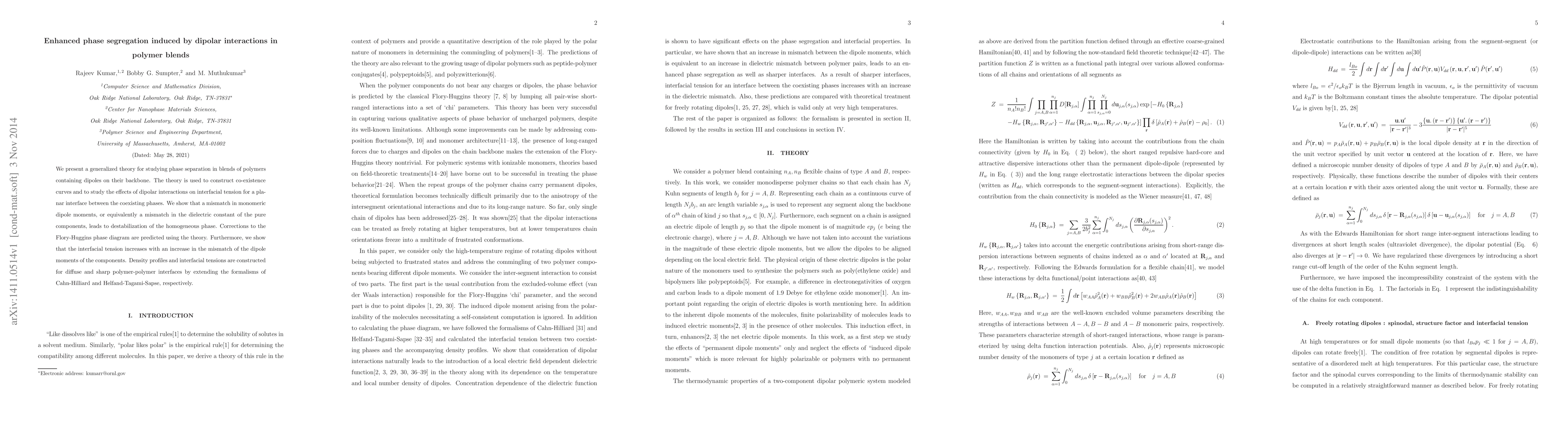 This paper develops a theoretical framework for understanding phase separation in polymer blends with dipoles, showing that dipolar interactions destabilize the homogeneous phase and increase interfacial tension. The study predicts corrections to the Flory-Huggins phase diagram and constructs density profiles for both diffuse and sharp interfaces.