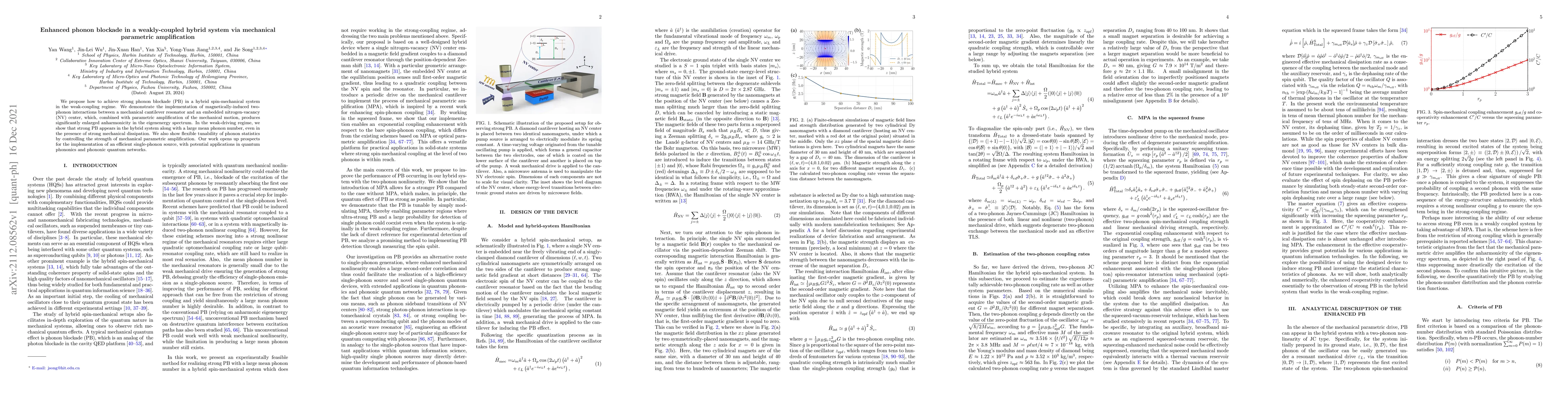 This paper proposes a method to enhance phonon blockade in a weakly-coupled hybrid spin-mechanical system through mechanical parametric amplification, demonstrating strong phonon blockade and tunable phonon statistics in a system with significant mechanical dissipation. The approach uses magnetically-induced two-phonon interactions and parametric amplification to achieve these results, with potential applications in quantum phononics and quantum networks.