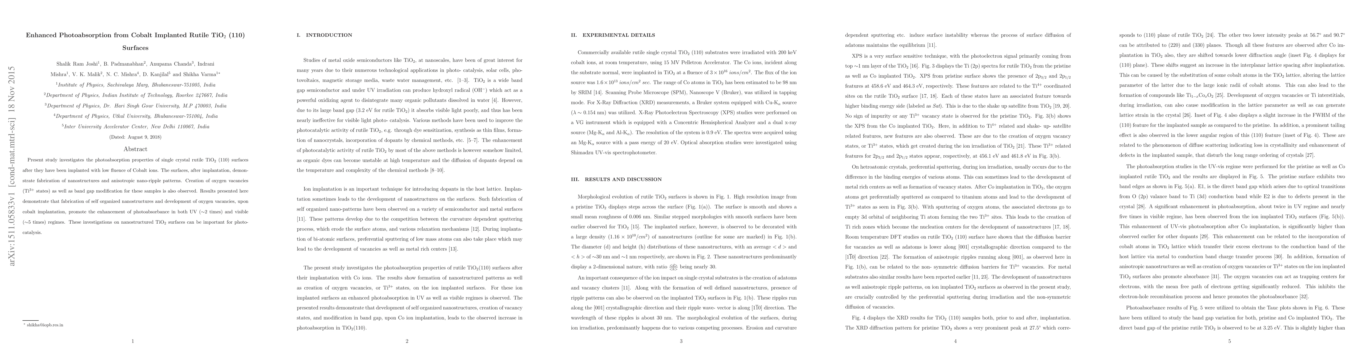 This study explores how cobalt implantation in rutile TiO2 (110) surfaces enhances photoabsorption, revealing the creation of nanostructures and oxygen vacancies, which significantly boost UV and visible light absorption by factors of 2 and 5, respectively. These findings are crucial for advancing photo-catalytic applications.