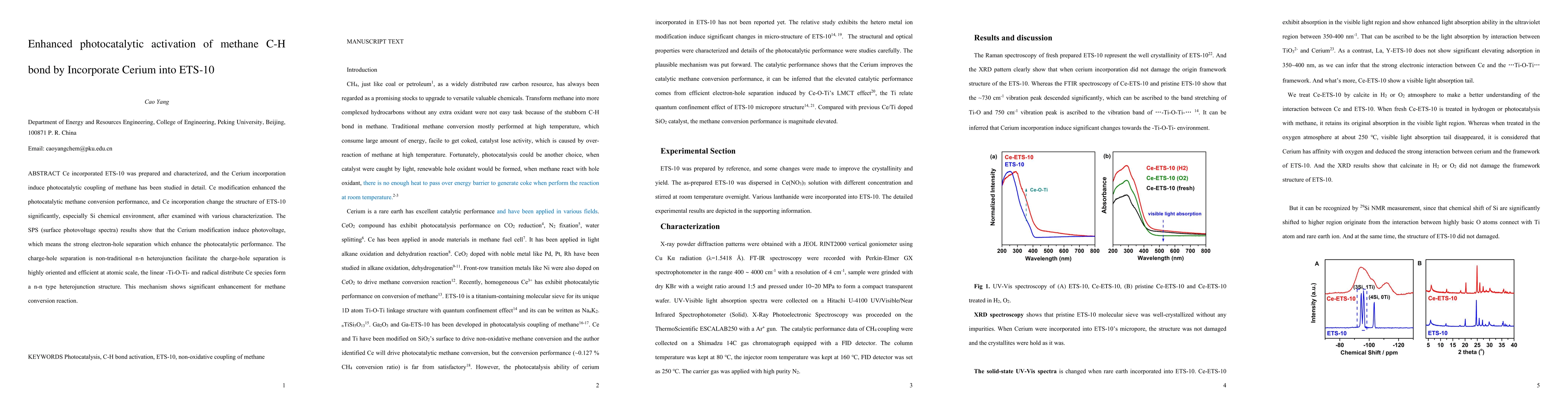 Ce-ETS-10 was prepared and their ability on photocatalysis coupling of methane has been studied in detail. Ce modification enhanced the photocatalysis performance of ETS-10 on methane conversion reaction, and the methane conversion can be carried out under irradiation of visible light. To study the various rare earth modification to ETS-10, various rare earth elements were introduced to ETS-10 molecular sieve, and the relative photocatalytic methane conversion performance were studied. Various characterizations were applied to examine rare earth modification behavior. The SPS results show that the Cerium modification induce visible light photovoltage, which means the strong electron-hole separation which enhance the photocatalytic performance. The charge-hole separation is non-traditional n-n heterojunction for the charge-hole separation is highly oriented and efficient at atomic scale. This mechanism shows significant enhancement for methane conversion reaction.