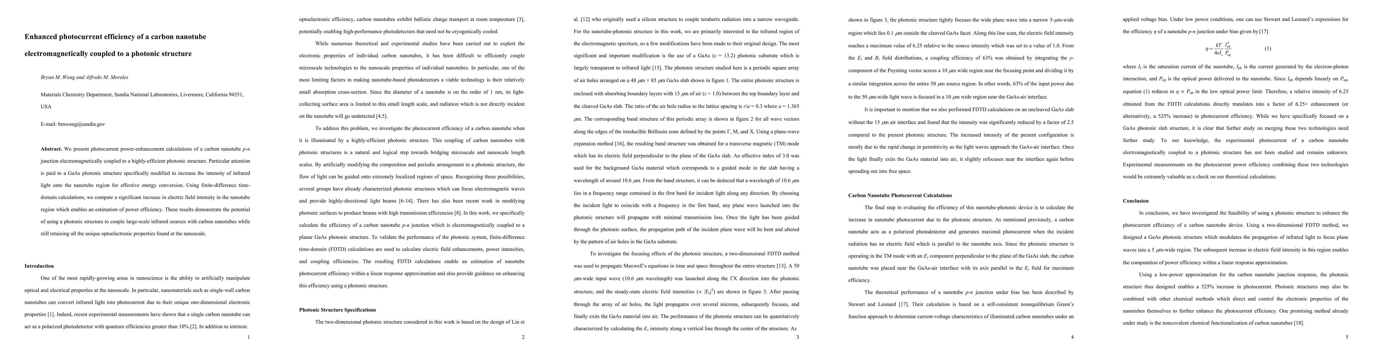 This study demonstrates enhanced photocurrent efficiency in a carbon nanotube p-n junction by electromagnetically coupling it to a modified GaAs photonic structure, which amplifies infrared light, resulting in significant electric field intensification and improved power efficiency for energy conversion.