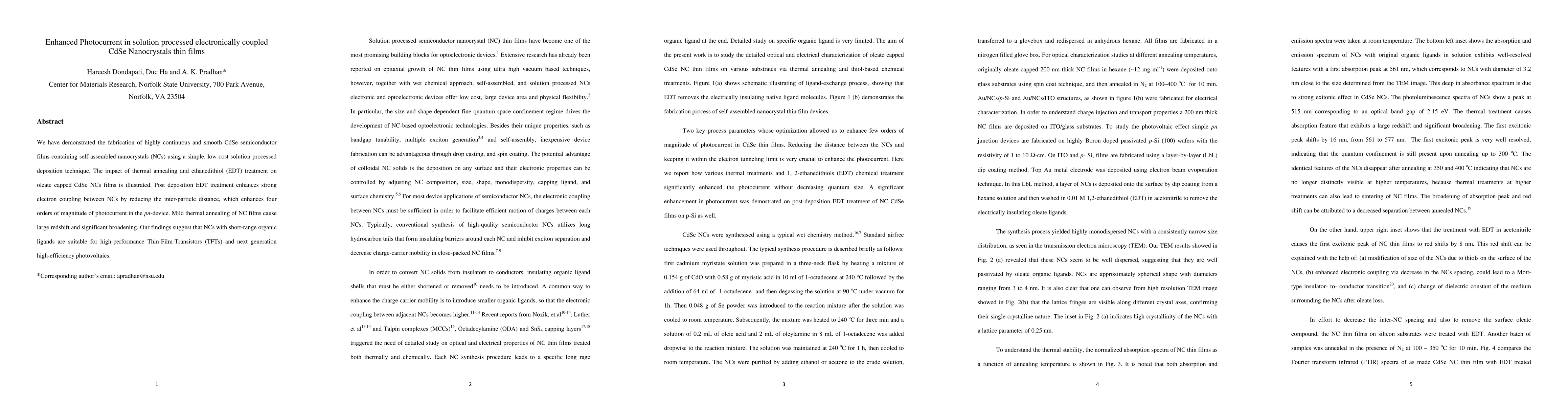 We have demonstrated the fabrication of highly continuous and smooth CdSe semiconductor films containing self-assembled nanocrystals (NCs) using a simple, low cost solution-processed deposition technique. The impact of thermal annealing and ethanedithiol (EDT) treatment on oleate capped CdSe NCs films is illustrated. Post deposition EDT treatment enhances strong electron coupling between NCs by reducing the inter-particle distance, which enhances four orders of magnitude of photocurrent in the pn-device. Mild thermal annealing of NC films cause large redshift and significant broadening. Our findings suggest that NCs with short-range organic ligands are suitable for high-performance Thin-Film-Transistors and next generation high-efficiency photovoltaics.