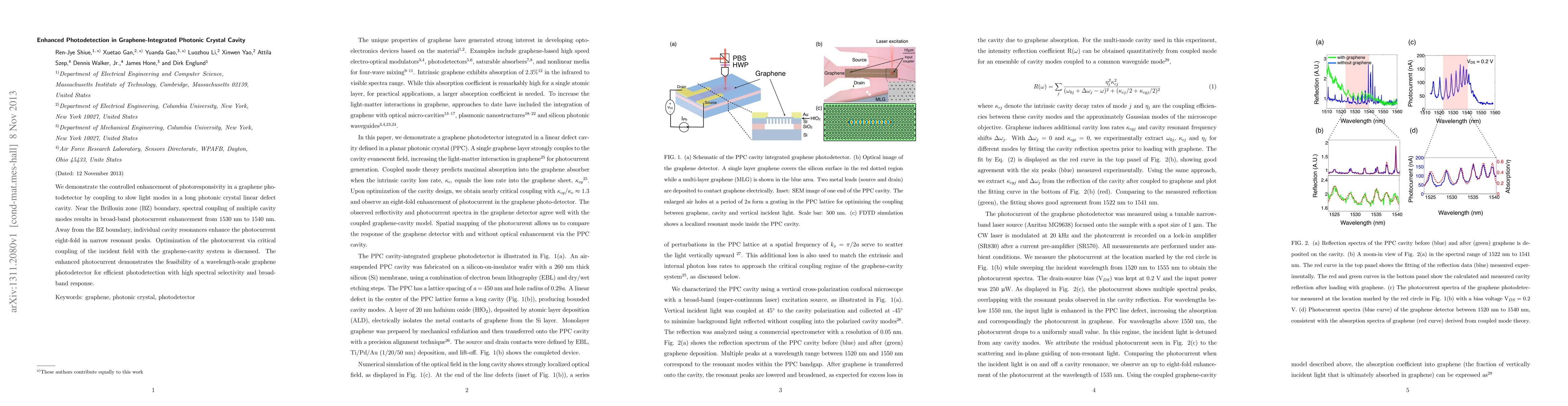 This study demonstrates enhanced photoresponsivity in a graphene-integrated photonic crystal cavity by leveraging slow light modes, achieving broad-band photocurrent enhancement and eight-fold enhancement in narrow peaks. The optimization of photocurrent via critical coupling shows the potential for a wavelength-scale graphene photodetector with high spectral selectivity and broadband response.