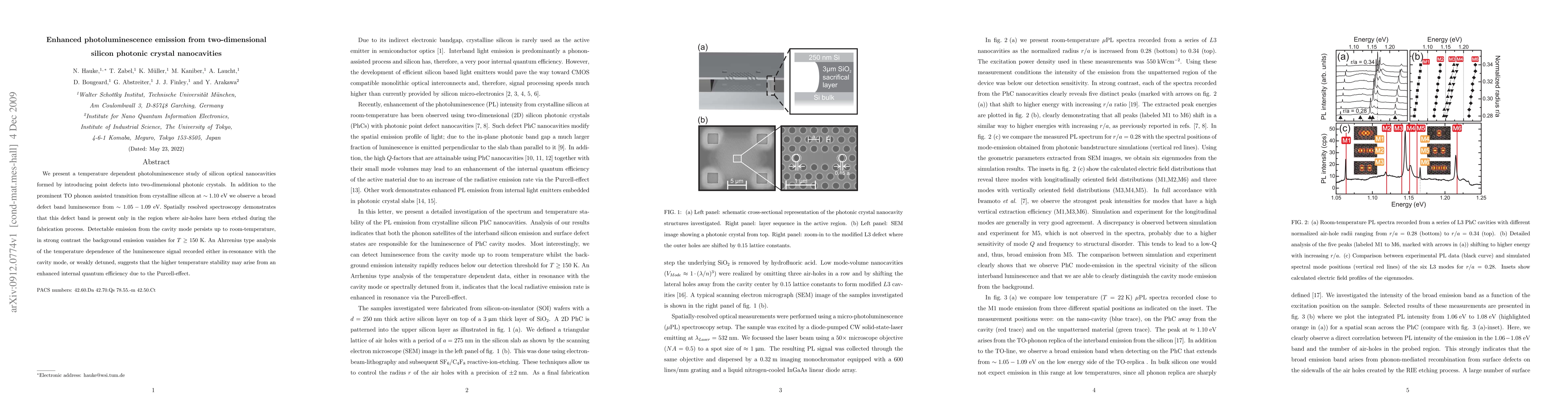 This study investigates temperature-dependent photoluminescence in silicon photonic crystal nanocavities, revealing enhanced emission stability up to room temperature due to the Purcell effect, while background emission vanishes above 150 K. The defect band luminescence correlates with the fabrication process, indicating its origin from etched air-holes.