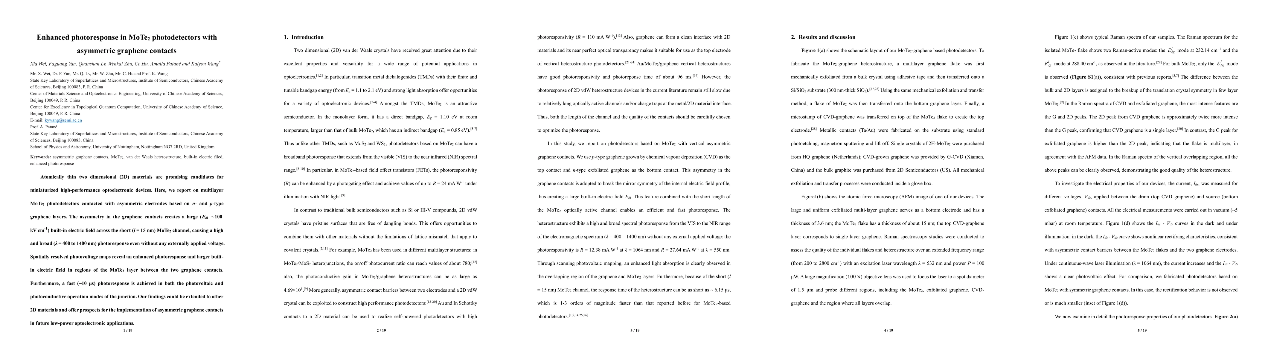 This study demonstrates multilayer MoTe2 photodetectors with asymmetric graphene contacts, showing enhanced photoresponse across a broad wavelength range (400 to 1400 nm) due to a large built-in electric field, along with a rapid (~0.01 ms) response time in both photovoltaic and photoconductive modes.