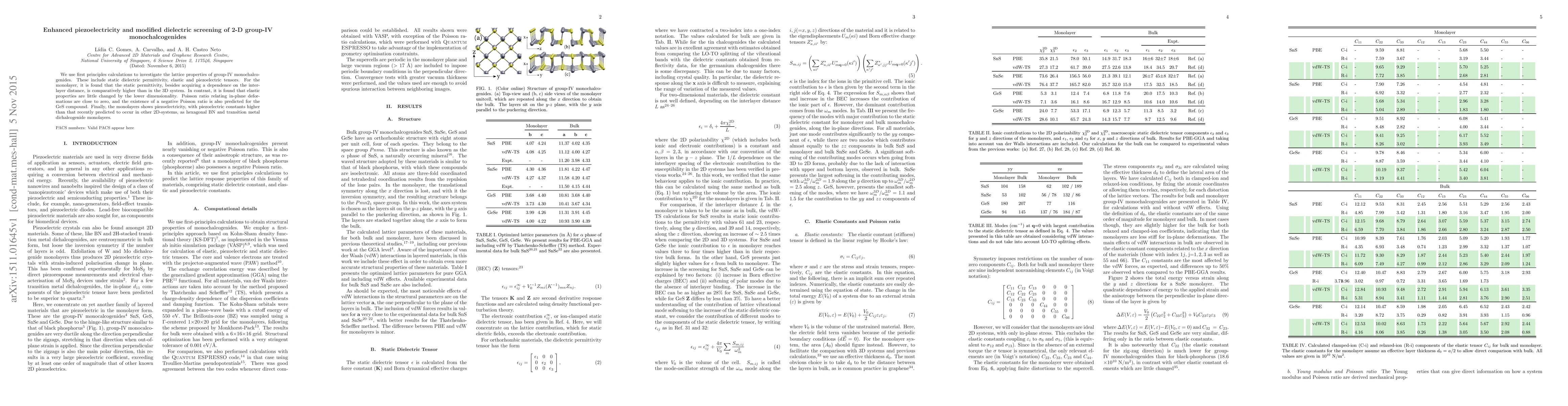 First principles calculations reveal enhanced piezoelectricity and modified dielectric screening in 2D group-IV monochalcogenides monolayers, with higher static permittivity and piezoelectric constants compared to their 3D counterparts and other 2D systems like hexagonal BN and transition metal dichalcogenides.