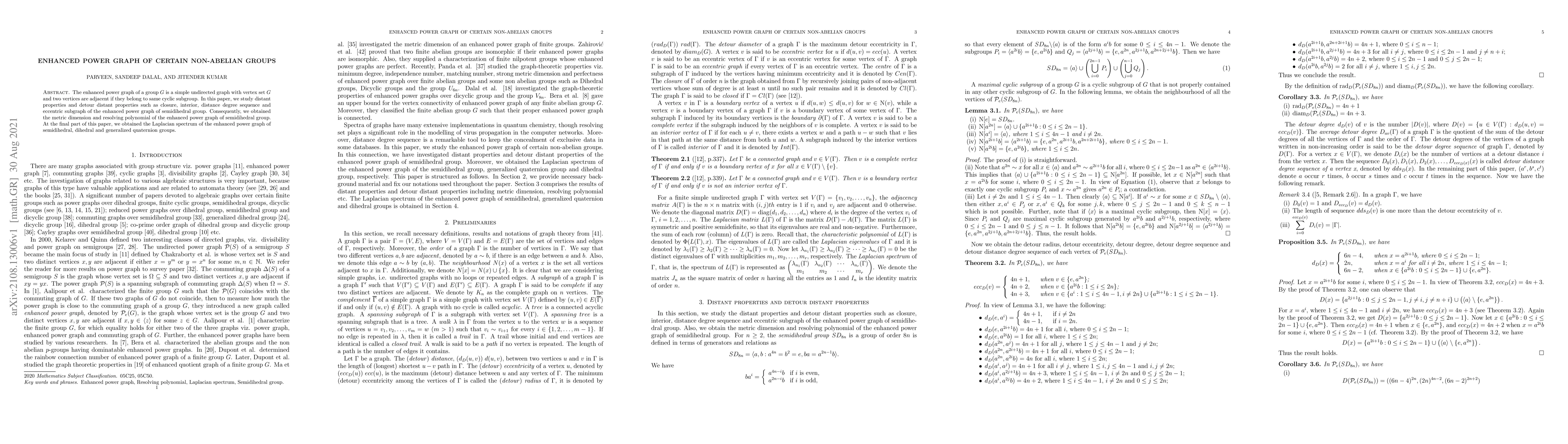 The enhanced power graph of a group $G$ is a simple undirected graph with vertex set $G$ and two vertices are adjacent if they belong to same cyclic subgroup. In this paper, we study distant properties and detour distant properties such as closure, interior, distance degree sequence and eccentric subgraph of the enhanced power graph of semidihedral group. Consequently, we obtained the metric dimension and resolving polynomial of the enhanced power graph of semidihedral group. At the final part of this paper, we obtained the Laplacian spectrum of the enhanced power graph of semidihedral, dihedral and generalized quaternion groups.