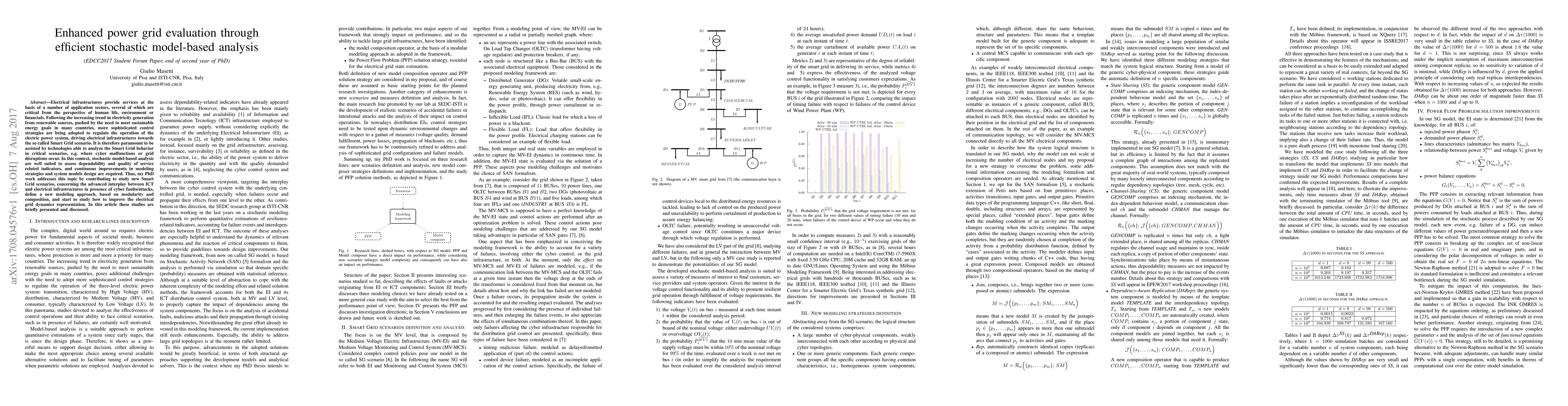 Electrical infrastructures provide services at the basis of a number of application sectors, several of which are critical from the perspective of human life, environment or financials. Following the increasing trend in electricity generation from renewable sources, pushed by the need to meet sustainable energy goals in many countries, more sophisticated control strategies are being adopted to regulate the operation of the electric power system, driving electrical infrastructures towards the so called Smart Grid scenario. It is therefore paramount to be assisted by technologies able to analyze the Smart Grid behavior in critical scenarios, e.g. where cyber malfunctions or grid disruptions occur. In this context, stochastic model-based analysis are well suited to assess dependability and quality of service related indicators, and continuous improvements in modeling strategies and system models design are required. Thus, my PhD work addresses this topic by contributing to study new Smart Grid scenarios, concerning the advanced interplay between ICT and electrical infrastructures in presence of cyber faults/attacks, define a new modeling approach, based on modularity and composition, and start to study how to improve the electrical grid dynamics representation. In this article these studies are briefly presented and discussed.