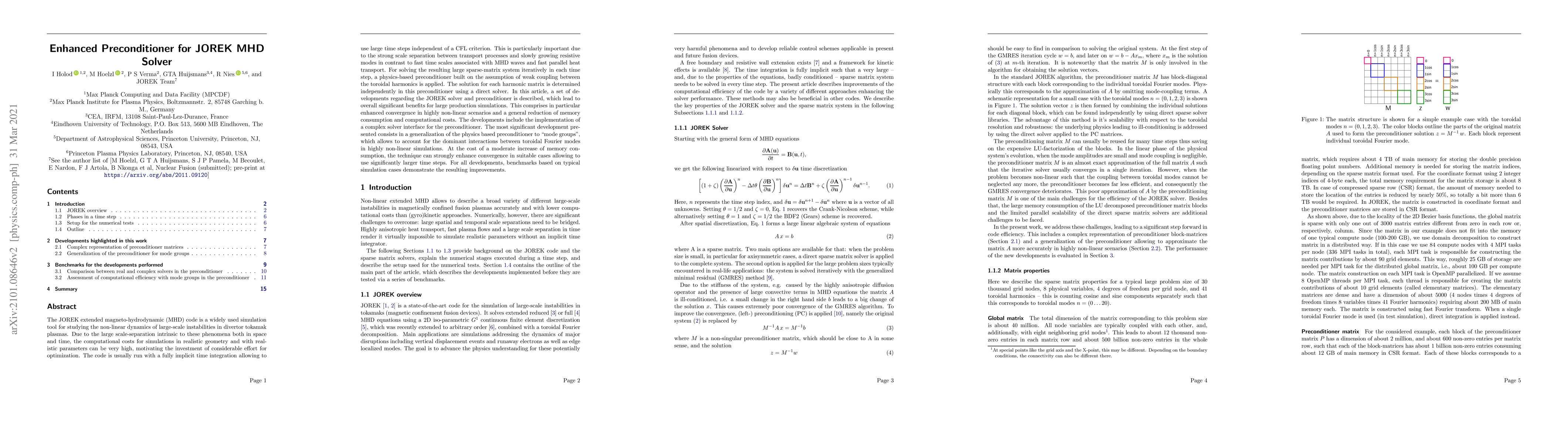 The paper details enhancements to the JOREK MHD solver, significantly improving convergence in complex, non-linear scenarios and reducing computational costs and memory consumption. A key development is a generalized, physics-based preconditioner for 'mode groups', enabling larger time steps with moderately increased memory use.