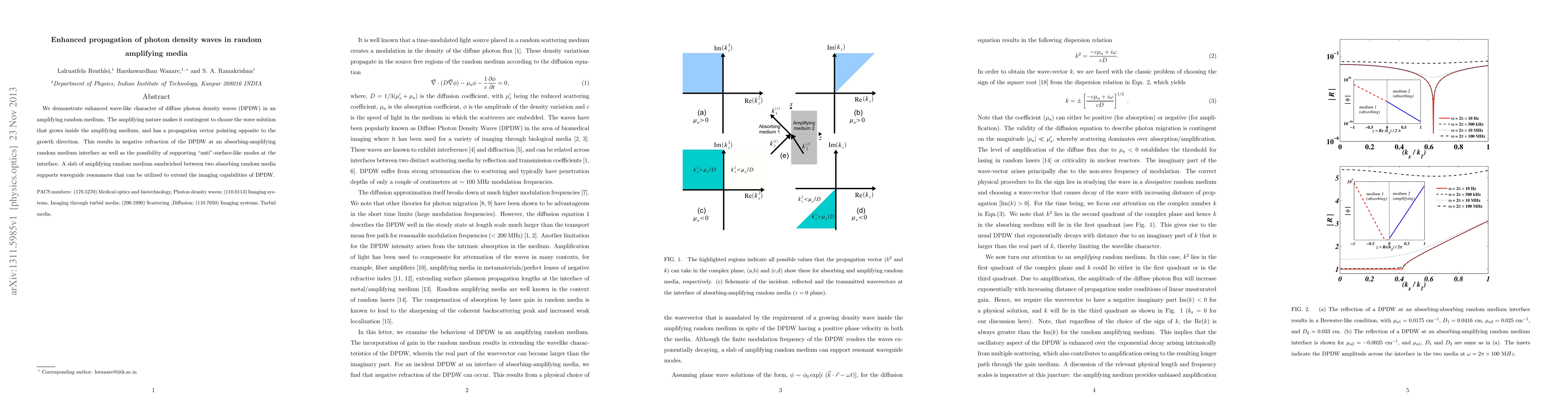 This paper shows that diffuse photon density waves (DPDW) exhibit enhanced propagation and negative refraction in amplifying random media, leading to the possibility of "anti"-surface modes and waveguide resonances that improve DPDW imaging capabilities.