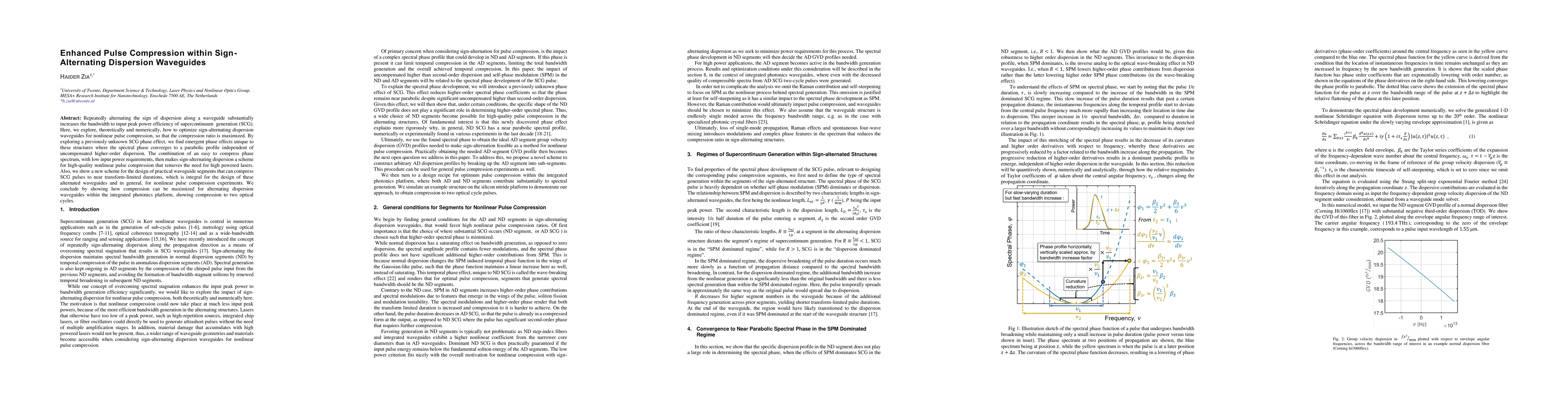 Repeatedly alternating the sign of dispersion along a waveguide substantially increases the bandwidth to input peak power efficiency of supercontinuum generation (SCG). Here, we explore, theoretically and numerically, how to optimize sign-alternating dispersion waveguides for nonlinear pulse compression, so that the compression ratio is maximized. By exploring a previously unknown SCG phase effect, we find emergent phase effects unique to these structures where the spectral phase converges to a parabolic profile independent of uncompensated higher-order dispersion. The combination of an easy to compress phase spectrum, with low input power requirements, then makes sign-alternating dispersion a scheme for high-quality nonlinear pulse compression that removes the need for high powered lasers. Also, we show a new scheme for the design of practical waveguide segments that can compress SCG pulses to near transform-limited durations, which is integral for the design of these alternated waveguides and in general, for nonlinear pulse compression experiments. We conclude by showing how compression can be maximized for alternating dispersion waveguides within the integrated photonics platform, showing compression to two optical cycles.