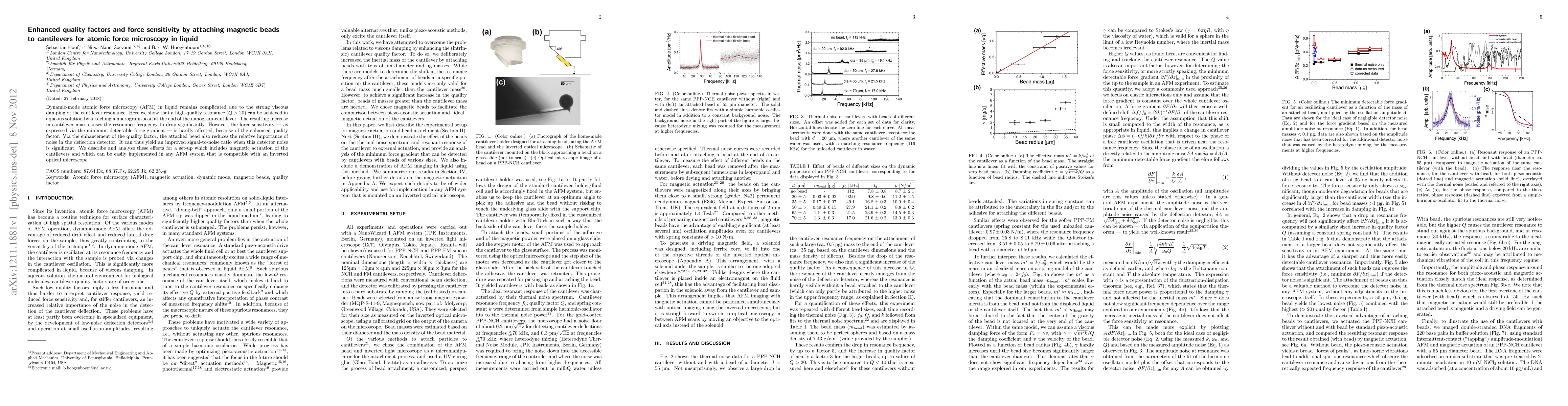 This paper demonstrates that attaching magnetic beads to nanogram-cantilever tips in liquid AFM enhances the quality factor (Q>20) and maintains force sensitivity despite a significant drop in resonance frequency due to increased mass. The setup improves signal-to-noise ratio by reducing the relative importance of detector noise.