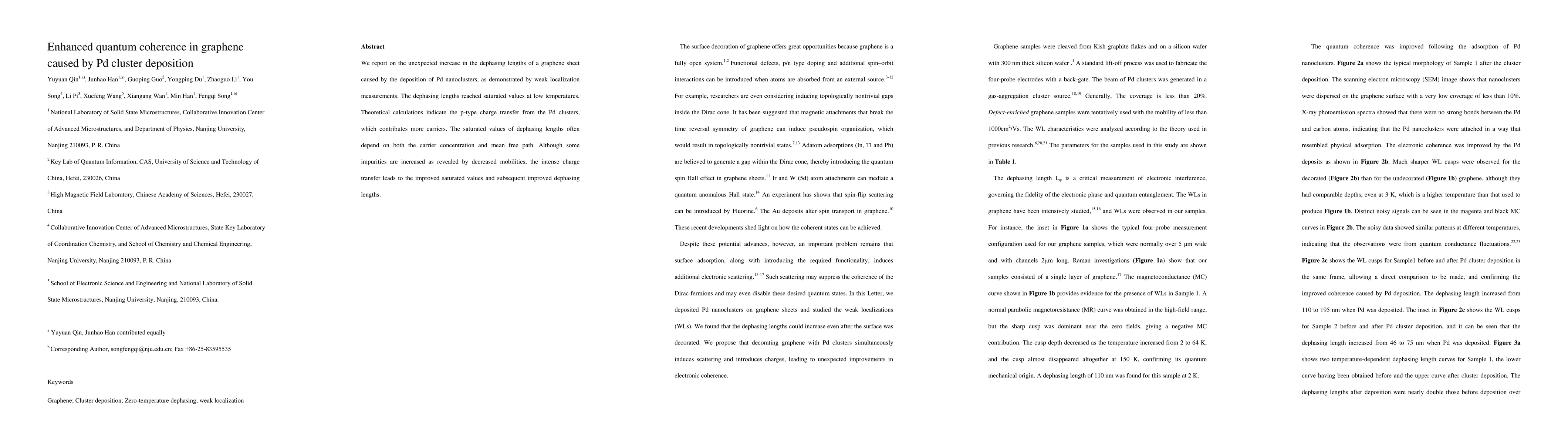 We report on the unexpected increase in the dephasing lengths of a graphene sheet caused by the deposition of Pd nanoclusters, as demonstrated by weak localization measurements. The dephasing lengths reached saturated values at low temperatures. Theoretical calculations indicate the p-type charge transfer from the Pd clusters, which contributes more carriers. The saturated values of dephasing lengths often depend on both the carrier concentration and mean free path. Although some impurities are increased as revealed by decreased mobilities, the intense charge transfer leads to the improved saturated values and subsequent improved dephasing lengths.