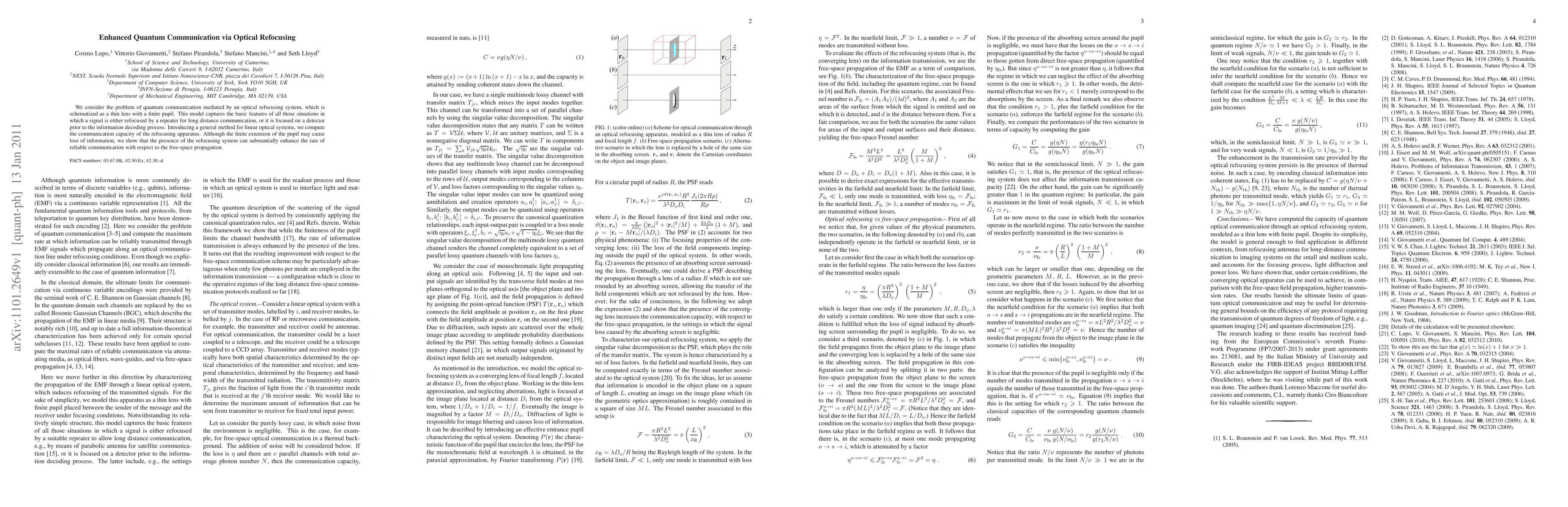 We consider the problem of quantum communication mediated by an optical refocusing system, which is schematized as a thin lens with a finite pupil. This model captures the basic features of all those situations in which a signal is either refocused by a repeater for long distance communication, or it is focused on a detector prior to the information decoding process. Introducing a general method for linear optical systems, we compute the communication capacity of the refocusing apparatus. Although the finite extension of the pupil may cause loss of information, we show that the presence of the refocusing system can substantially enhance the rate of reliable communication with respect to the free-space propagation.