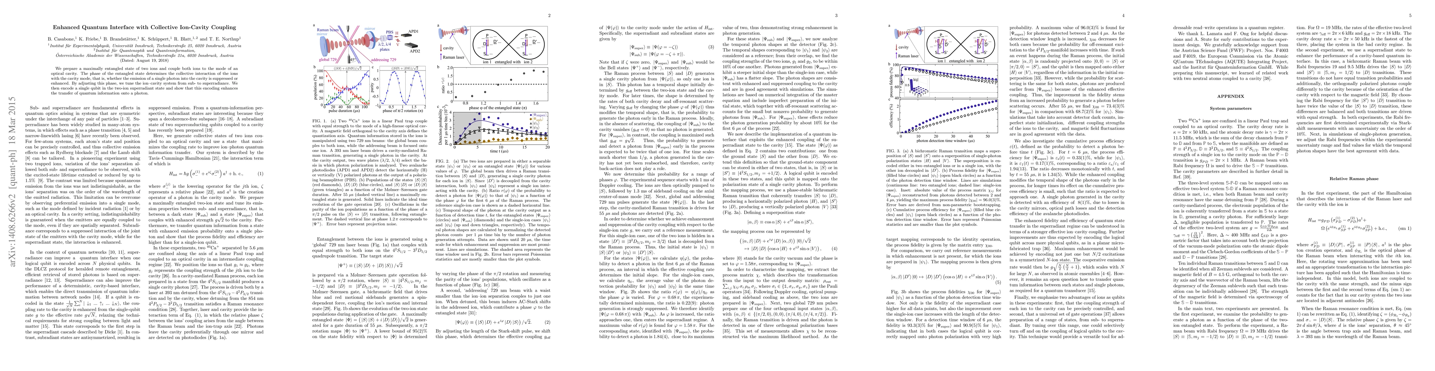 This research demonstrates a quantum interface where two entangled ions are coupled to an optical cavity, enabling control over collective ion-cavity interactions through phase adjustment, achieving superradiance. The study shows enhanced quantum information transfer onto a photon by encoding a single qubit in the superradiant state.