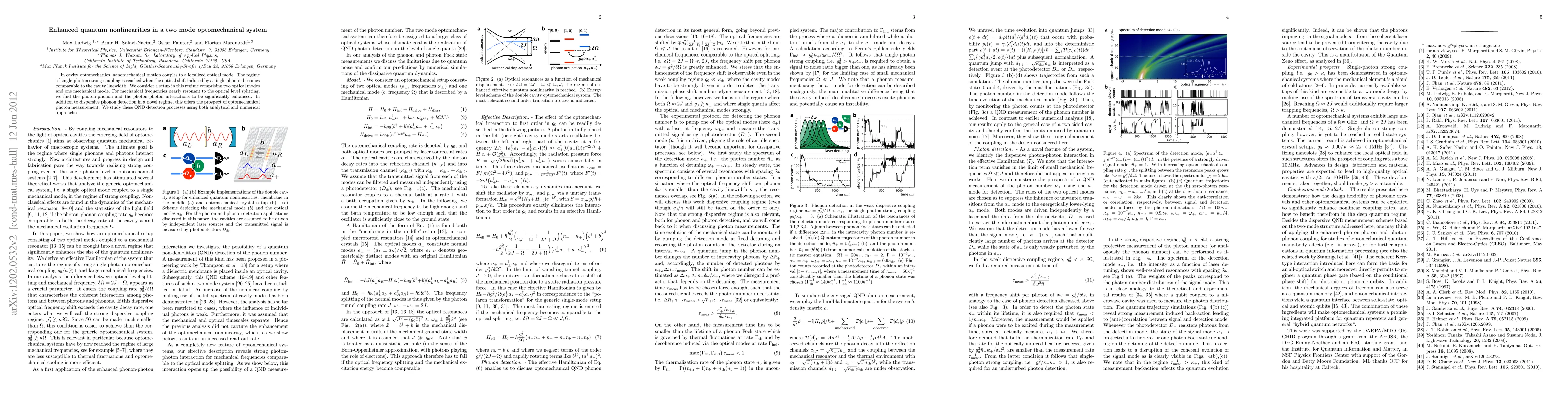 This paper investigates a two-mode optomechanical system where single-photon strong coupling is achieved, leading to significant enhancements in photon-phonon and photon-photon interactions. The study explores novel quantum nonlinearities and the potential for optomechanical photon measurement through quantum nondemolition detection processes.