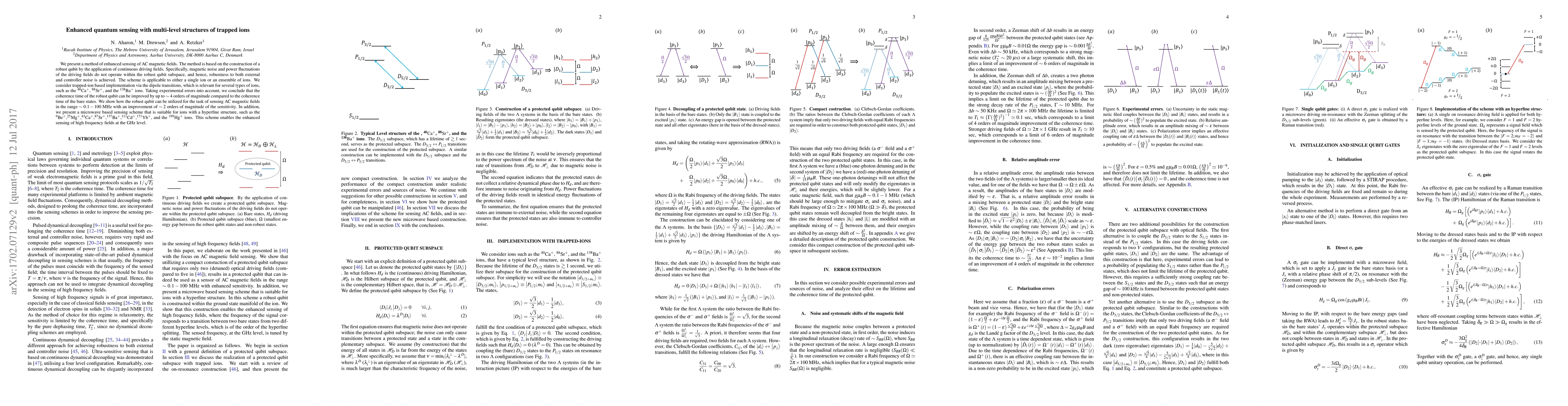 We present a method of sensing AC magnetic fields. The method is based on the construction of a robust qubit by the application of continuous driving fields. Specifically, magnetic noise and power fluctuations of the driving fields do not operate within the robust qubit subspace, and hence, robustness to both external and controller noise is achieved. We consider trapped-ion based implementation via the dipole transitions, which is relevant for several types of ions, such as the $^{40}{\rm{Ca}}^{+}$, $^{88}{\rm{Sr}}^{+}$, and the $^{138}{\rm{Ba}}^{+}$ ions. Taking experimental errors into account, we conclude that the coherence time of the robust qubit can be improved by up to $\sim 4$ orders of magnitude compared to the coherence time of the bare states. We show how the robust qubit can be utilized for the task of sensing AC magnetic fields, leading to an improvement of $\sim 2$ orders of magnitude of the sensitivity. In addition, we present a microwave based sensing scheme that is suitable for ions with a hyperfine structure, such as the $^{9}{\rm{Be}}^{+}$,$^{25}{\rm{Mg}}^{+}$,$^{43}{\rm{Ca}}^{+}$,$^{87}{\rm{Sr}}^{+}$,$^{137}{\rm{Ba}}^{+}$,$^{111}{\rm{Cd}}^{+}$,$^{171}{\rm{Yb}}^{+}$, and the $^{199}{\rm{Hg}}^{+}$ ions. This scheme enables the enhanced sensing of high frequency fields at the GHz level.