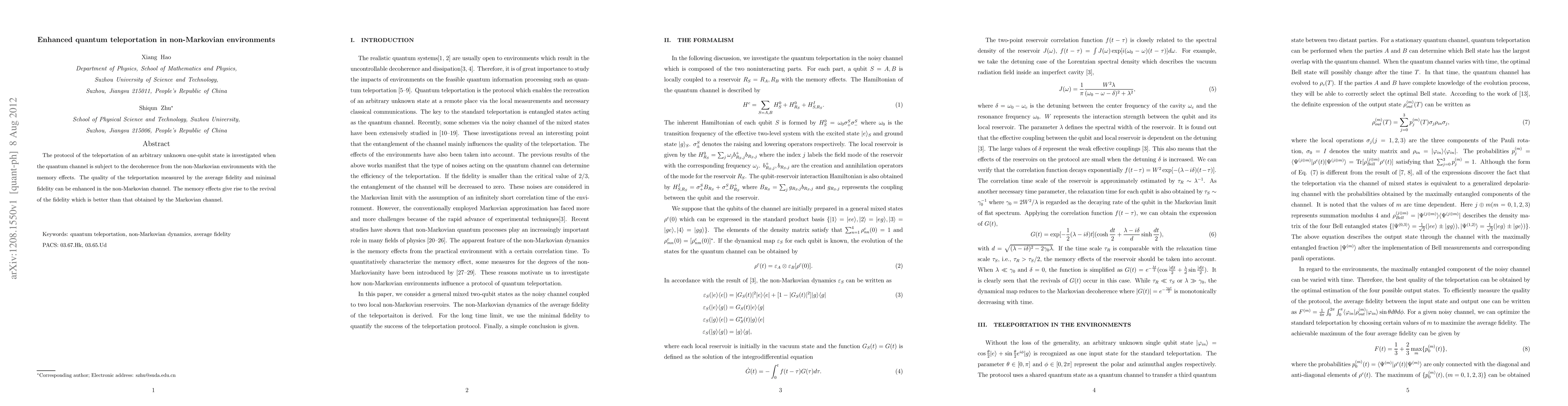 This paper investigates quantum teleportation in non-Markovian environments, showing that memory effects can enhance fidelity, leading to better teleportation quality compared to Markovian channels. The fidelity revival observed in non-Markovian settings outperforms that of Markovian channels.