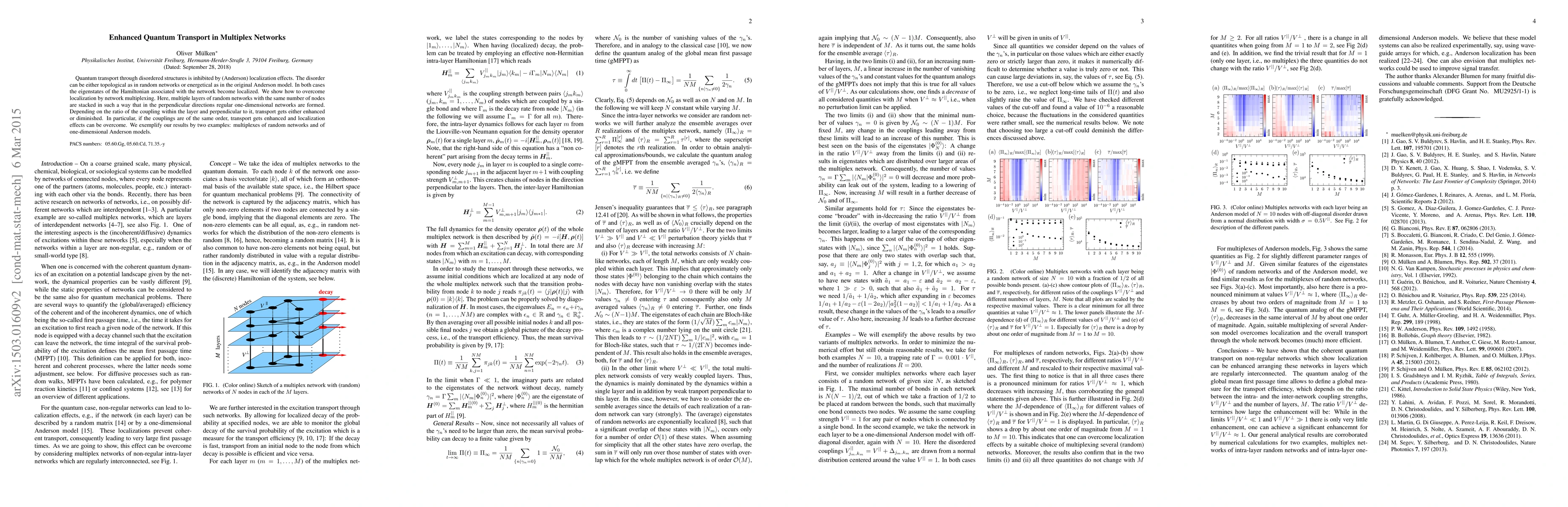 Quantum transport through disordered structures is inhibited by (Anderson) localization effects. The disorder can be either topological as in random networks or energetical as in the original Anderson model. In both cases the eigenstates of the Hamiltonian associated with the network become localized. We show how to overcome localization by network multiplexing. Here, multiple layers of random networks with the same number of nodes are stacked in such a way that in the perpendicular directions regular one-dimensional networks are formed. Depending on the ratio of the coupling within the layer and perpendicular to it, transport gets either enhanced or diminished. In particular, if the couplings are of the same order, transport gets enhanced and localization effects can be overcome. We exemplify our results by two examples: multiplexes of random networks and of one-dimensional Anderson models.