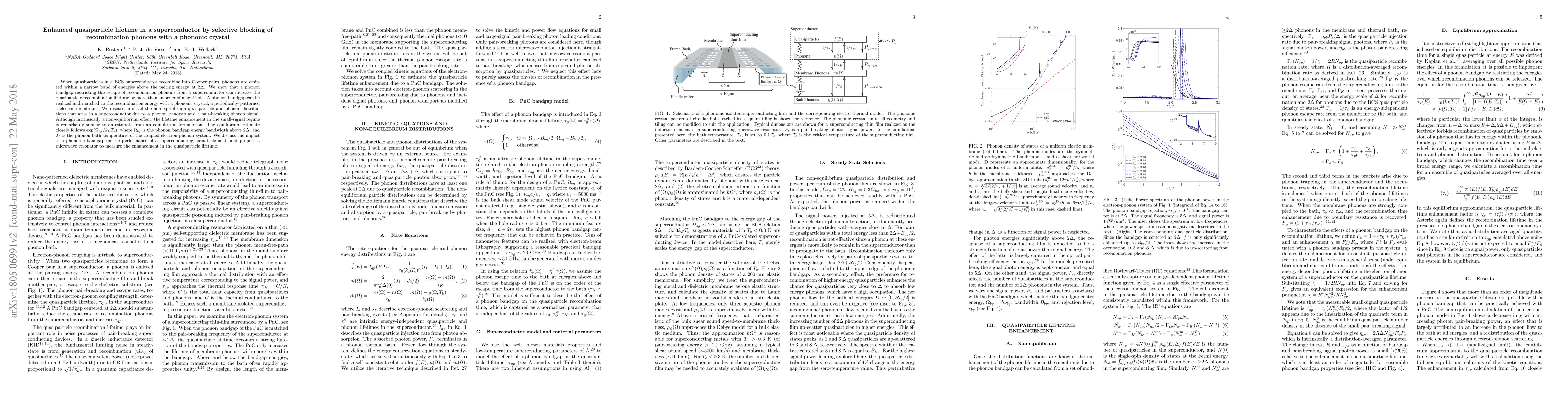 This paper demonstrates that embedding a superconductor in a phononic crystal can significantly enhance quasiparticle recombination lifetime by blocking recombination phonons, leading to a more than tenfold increase. The phonon bandgap effect, realized through a phononic crystal, is shown to closely follow an equilibrium formulation, suggesting potential improvements in superconducting device performance.