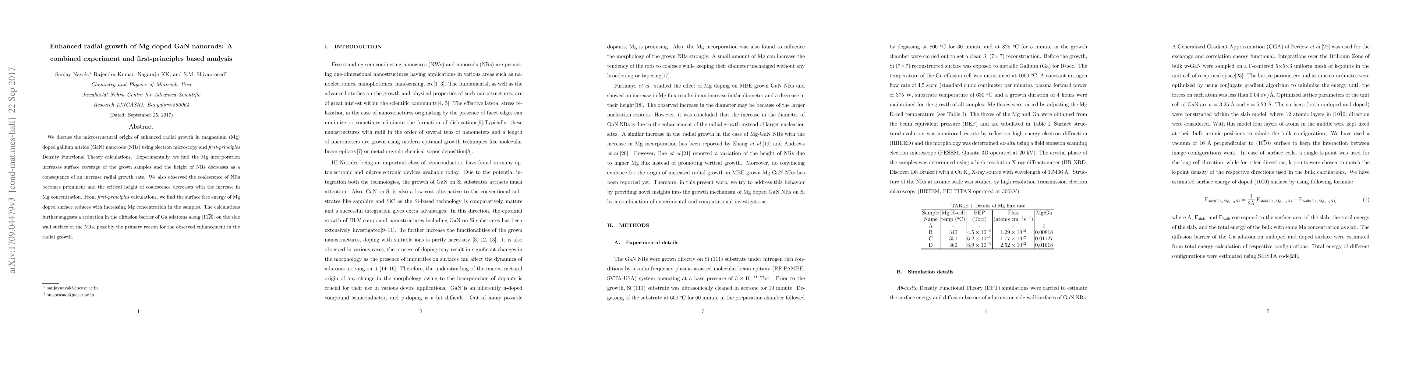 This paper investigates the enhanced radial growth in Mg-doped GaN nanorods through electron microscopy and Density Functional Theory. Experimental results show increased Mg incorporation boosts radial growth and reduces nanorod height, while first-principles calculations suggest a lower diffusion barrier for Ga adatoms as the primary reason for this enhancement.
