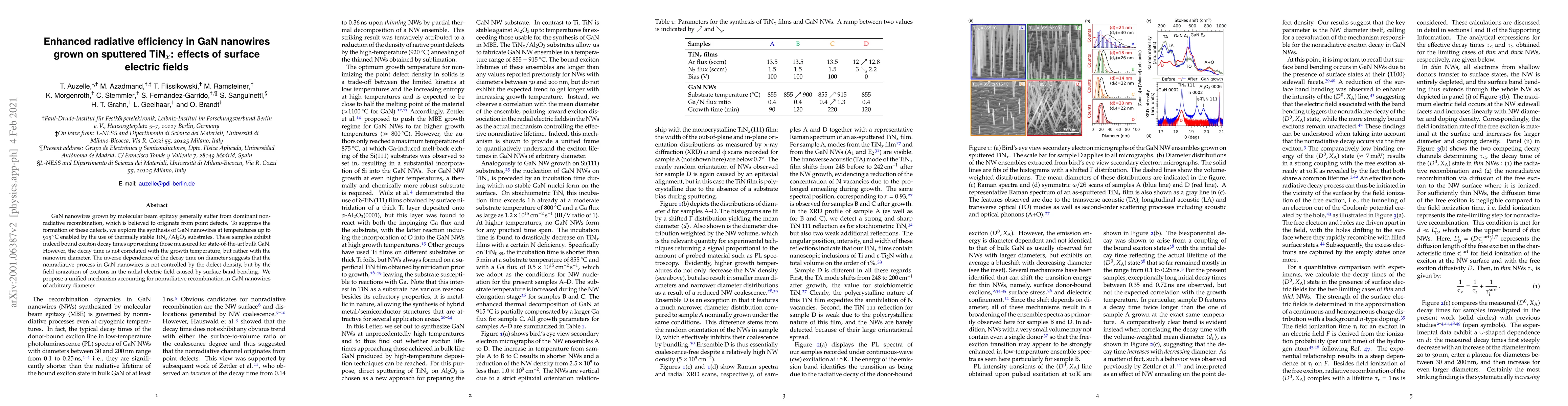 This study investigates GaN nanowires grown on sputtered TiN$_x$ substrates to enhance radiative efficiency by suppressing nonradiative recombination. The research finds that the decay time of excitons is inversely dependent on the nanowire diameter, indicating that surface electric fields, rather than defect density, control nonradiative recombination.