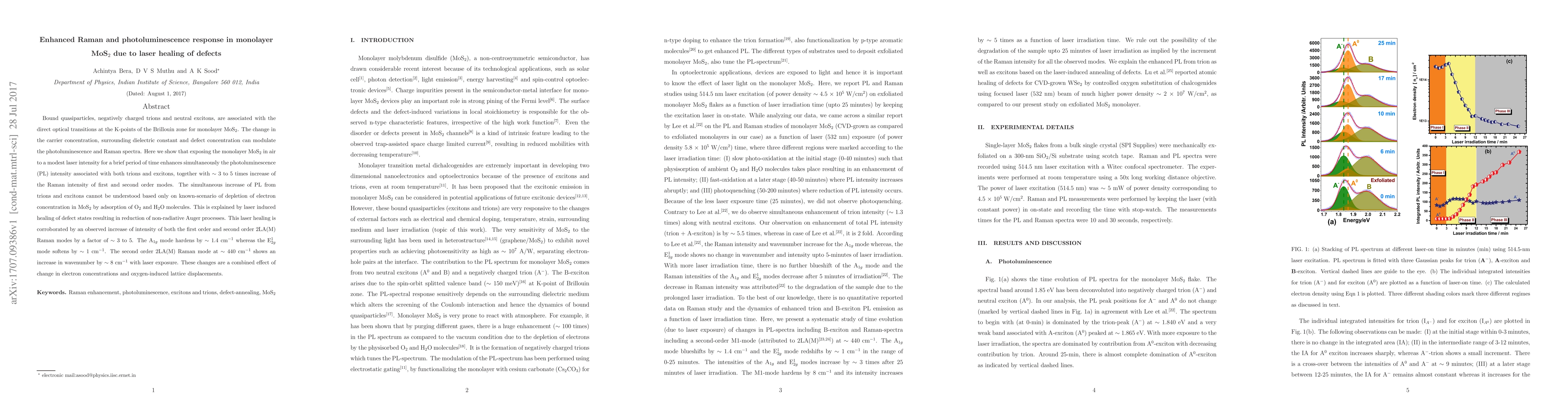 Bound quasiparticles, negatively charged trions and neutral excitons, are associated with the direct optical transitions at the K-points of the Brillouin zone for monolayer MoS$_2$. The change in the carrier concentration, surrounding dielectric constant and defect concentration can modulate the photoluminescence and Raman spectra. Here we show that exposing the monolayer MoS$_2$ in air to a modest laser intensity for a brief period of time enhances simultaneously the photoluminescence (PL) intensity associated with both trions and excitons, together with $\sim$ 3 to 5 times increase of the Raman intensity of first and second order modes. The simultaneous increase of PL from trions and excitons cannot be understood based only on known-scenario of depletion of electron concentration in MoS$_2$ by adsorption of O$_2$ and H$_2$O molecules. This is explained by laser induced healing of defect states resulting in reduction of non-radiative Auger processes. This laser healing is corroborated by an observed increase of intensity of both the first order and second order 2LA(M) Raman modes by a factor of $\sim$ 3 to 5. The A$_{1g}$ mode hardens by $\sim$ 1.4 cm$^{-1}$ whereas the E$^1_{2g}$ mode softens by $\sim$ 1 cm$^{-1}$. The second order 2LA(M) Raman mode at $\sim$ 440 cm$^{-1}$ shows an increase in wavenumber by $\sim$ 8 cm$^{-1}$ with laser exposure. These changes are a combined effect of change in electron concentrations and oxygen-induced lattice displacements.