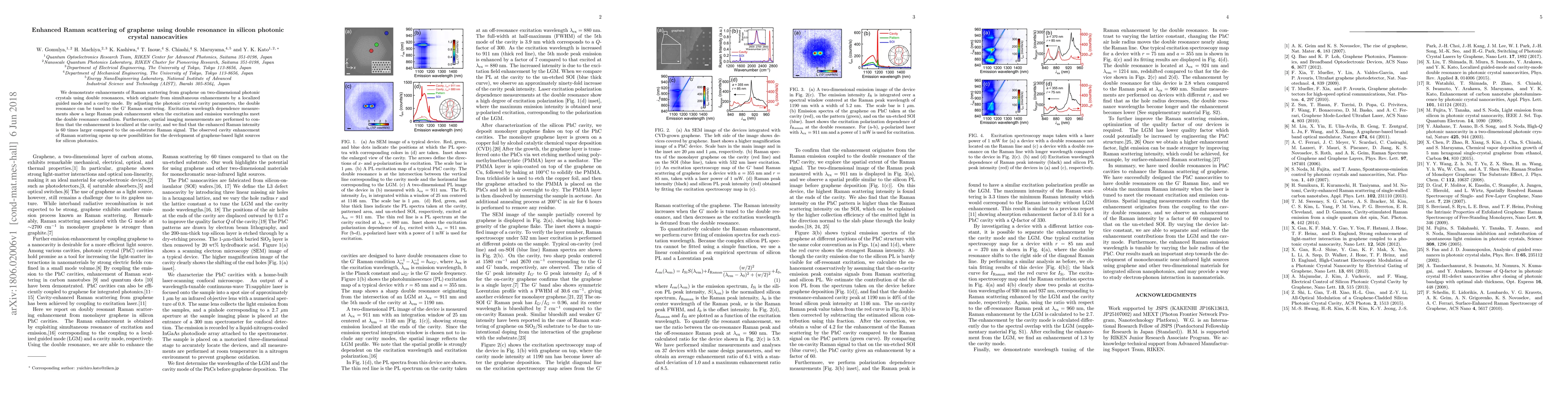 This paper demonstrates significant Raman scattering enhancement of graphene by utilizing double resonances in silicon photonic crystal nanocavities, achieving a 60-fold increase in intensity compared to traditional methods. The double resonance, originating from both a localized guided mode and a cavity mode, enables tuning to specific Raman scattering peaks.