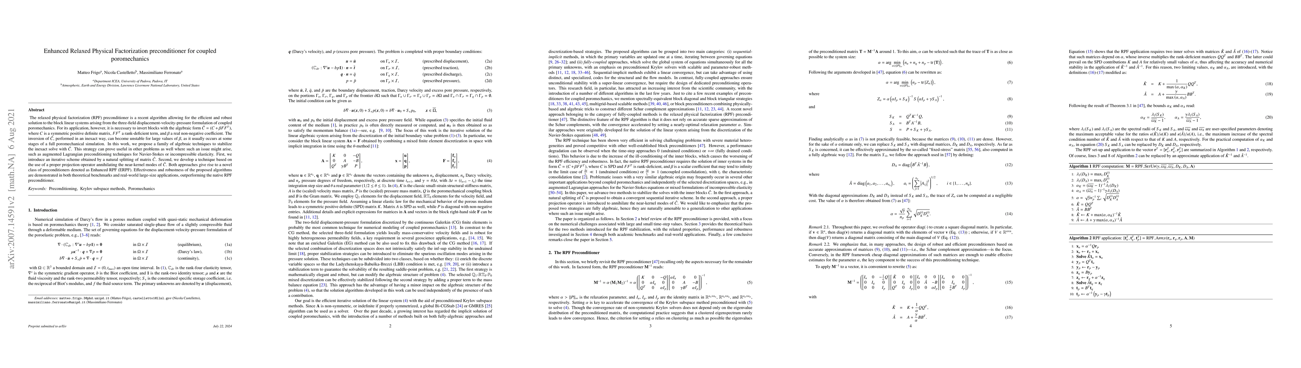 The relaxed physical factorization (RPF) preconditioner is a recent algorithm allowing for the efficient and robust solution to the block linear systems arising from the three-field displacement-velocity-pressure formulation of coupled poromechanics. For its application, however, it is necessary to invert blocks with the algebraic form $\hat{C} = ( C + \beta F F^T)$, where $C$ is a symmetric positive definite matrix, $FF^T$ a rank-deficient term, and $\beta$ a real non-negative coefficient. The inversion of $\hat{C}$, performed in an inexact way, can become unstable for large values of $\beta$, as it usually occurs at some stages of a full poromechanical simulation. In this work, we propose a family of algebraic techniques to stabilize the inexact solve with $\hat{C}$. This strategy can prove useful in other problems as well where such an issue might arise, such as augmented Lagrangian preconditioning techniques for Navier-Stokes or incompressible elasticity. First, we introduce an iterative scheme obtained by a natural splitting of matrix $\hat{C}$. Second, we develop a technique based on the use of a proper projection operator annihilating the near-kernel modes of $\hat{C}$. Both approaches give rise to a novel class of preconditioners denoted as Enhanced RPF (ERPF). Effectiveness and robustness of the proposed algorithms are demonstrated in both theoretical benchmarks and real-world large-size applications, outperforming the native RPF preconditioner.