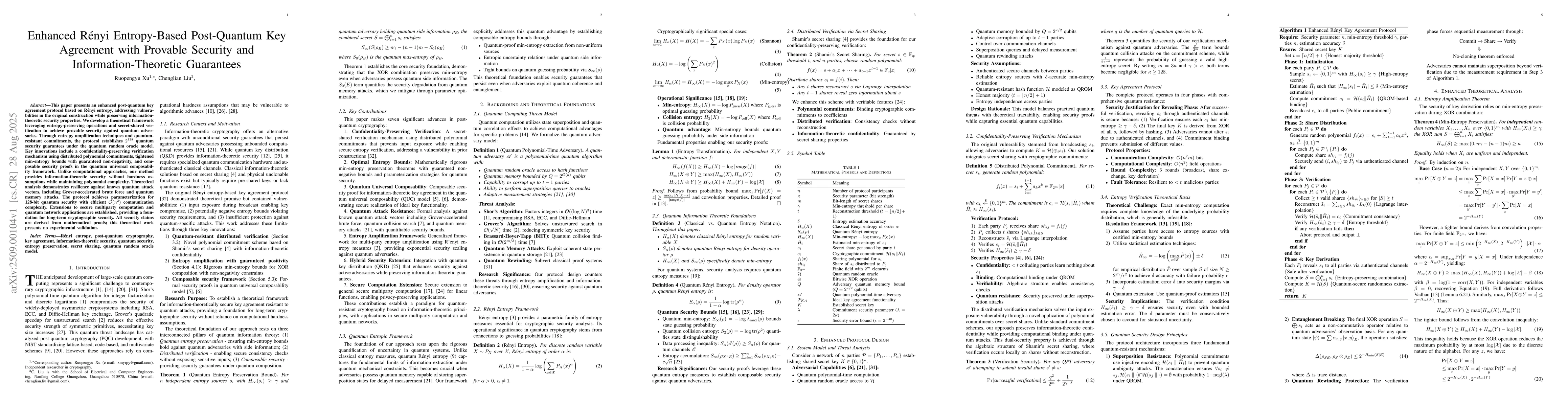 This paper presents an enhanced post-quantum key agreement protocol based on R\'{e}nyi entropy, addressing vulnerabilities in the original construction while preserving information-theoretic security properties. We develop a theoretical framework leveraging entropy-preserving operations and secret-shared verification to achieve provable security against quantum adversaries. Through entropy amplification techniques and quantum-resistant commitments, the protocol establishes $2^{128}$ quantum security guarantees under the quantum random oracle model. Key innovations include a confidentiality-preserving verification mechanism using distributed polynomial commitments, tightened min-entropy bounds with guaranteed non-negativity, and composable security proofs in the quantum universal composability framework. Unlike computational approaches, our method provides information-theoretic security without hardness assumptions while maintaining polynomial complexity. Theoretical analysis demonstrates resilience against known quantum attack vectors, including Grover-accelerated brute force and quantum memory attacks. The protocol achieves parameterization for 128-bit quantum security with efficient $\mathcal{O}(n^2)$ communication complexity. Extensions to secure multiparty computation and quantum network applications are established, providing a foundation for long-term cryptographic security. All security claims are derived from mathematical proofs; this theoretical work presents no experimental validation.