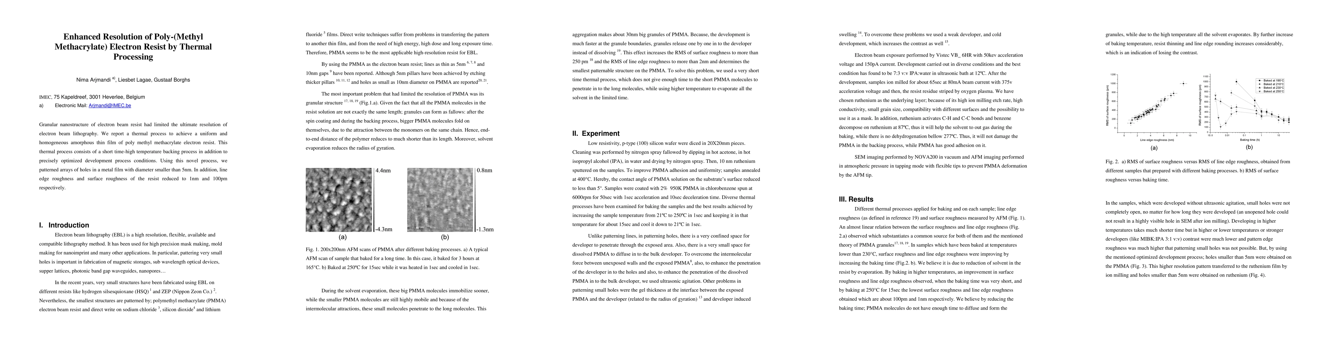 This paper presents a thermal process to enhance the resolution of poly-methyl methacrylate electron resist, achieving a uniform amorphous thin film and enabling the patterning of sub-5nm holes in metal films, with reduced line edge and surface roughness.