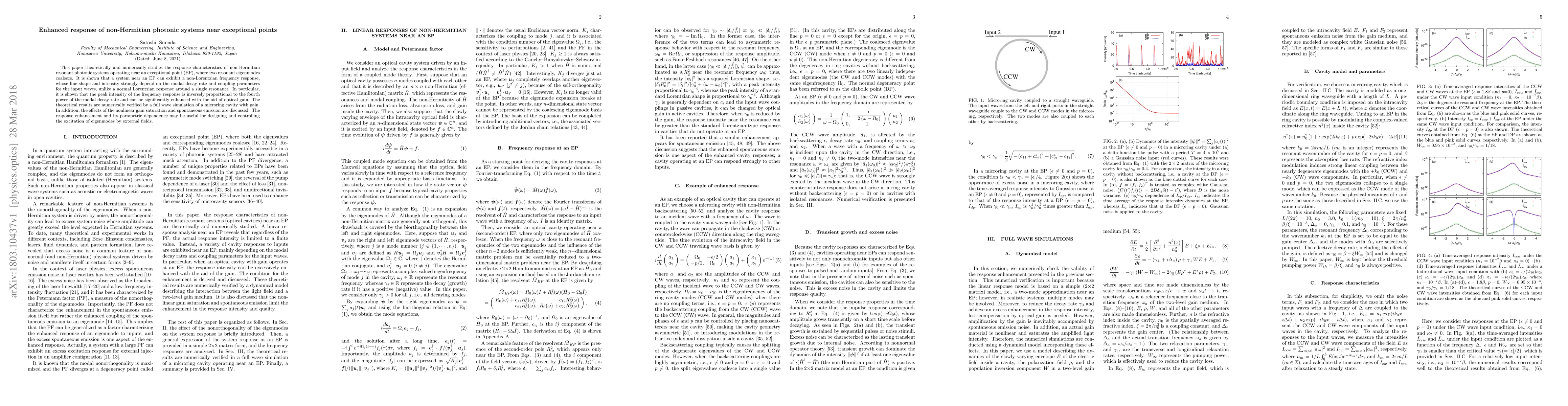 This paper investigates the enhanced response of non-Hermitian photonic systems near exceptional points, revealing a non-Lorentzian frequency response dependent on decay rates and coupling parameters. The peak intensity is shown to be inversely proportional to the fourth power of the modal decay rate and can be significantly amplified with optical gain.