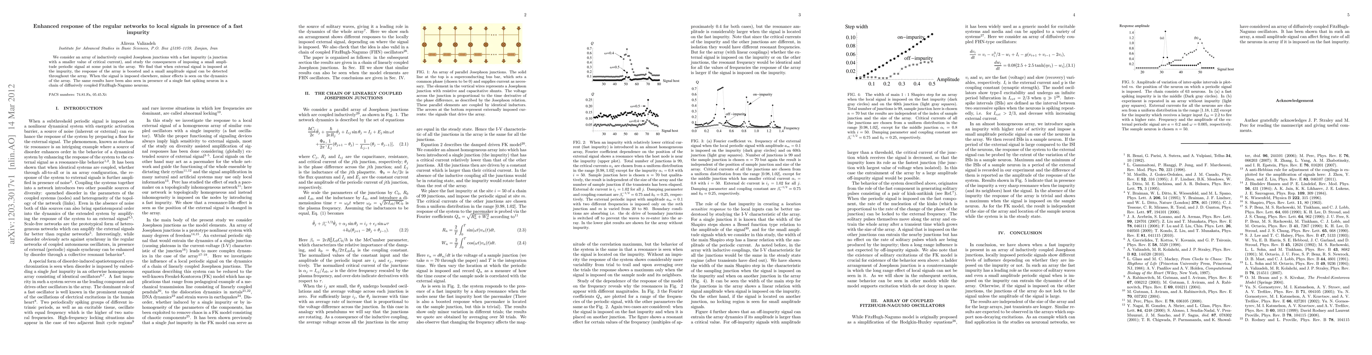 We consider an array of inductively coupled Josephson junctions with a fast impurity (a junction with a smaller value of critical current), and study the consequences of imposing a small amplitude periodic signal at some point in the array. We find that when external signal is imposed at the impurity, the response of the array is boosted and a small amplitude signal can be detected throughout the array. When the signal is imposed elsewhere, minor effects is seen on the dynamics of the array. The same results have been also seen in presence of a single fast spiking neuron in a chain of diffusively coupled FitzHugh-Nagumo neurons.