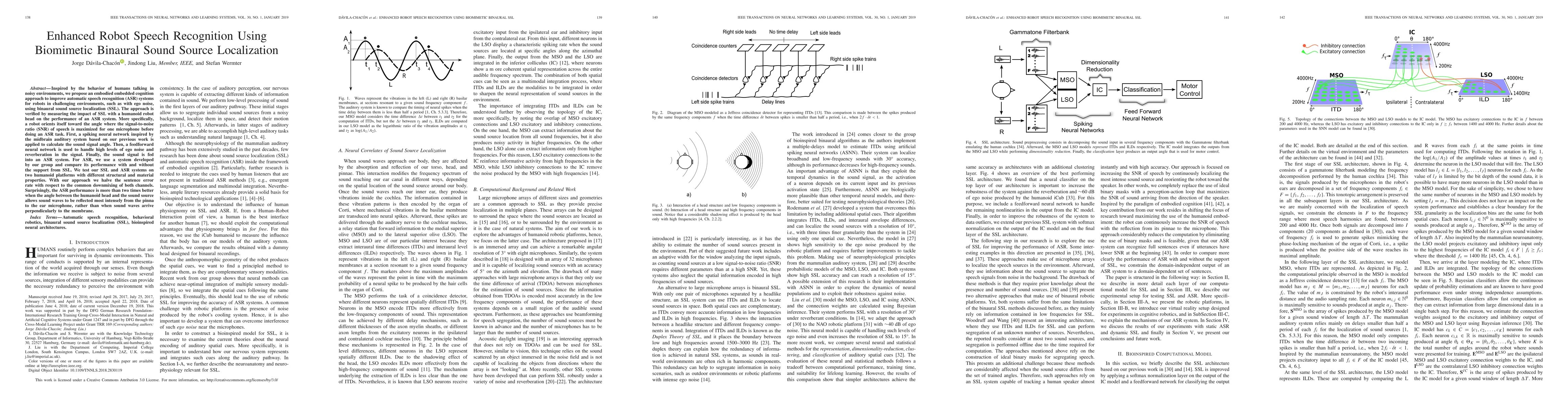 This paper proposes an embodied cognition approach using binaural sound source localization (SSL) to enhance robot speech recognition in noisy environments. The method involves a spiking neural network for angle calculation and a feedforward neural network to manage ego noise, significantly improving ASR performance by halving the sentence error rate compared to traditional downmixing.