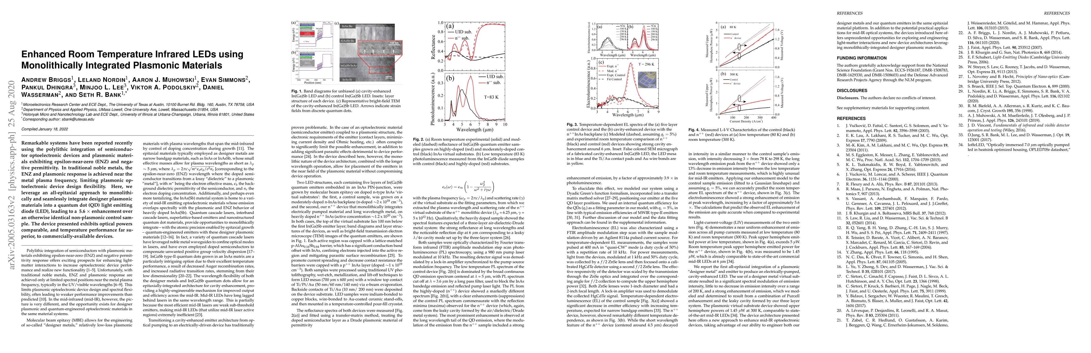 This paper reports on the development of enhanced room temperature infrared LEDs by integrating plasmonic materials using an all-epitaxial approach, achieving a ~5.6x enhancement over non-plasmonic controls, and demonstrating superior temperature performance. The integration allows for greater design flexibility compared to traditional noble metals.