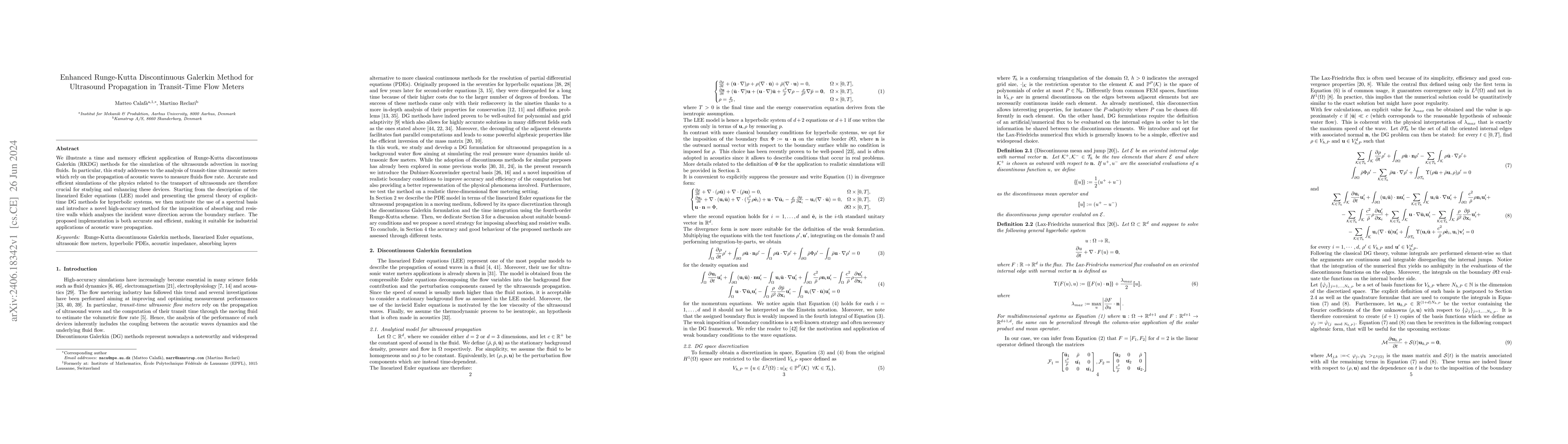 This paper proposes a time and memory efficient Runge-Kutta discontinuous Galerkin method for simulating ultrasound propagation in transit-time flow meters, focusing on accurate simulations of acoustic wave transport to enhance device performance. The method employs a spectral basis and a novel approach for boundary conditions to analyze wave direction, demonstrating high accuracy and efficiency suitable for industrial applications.