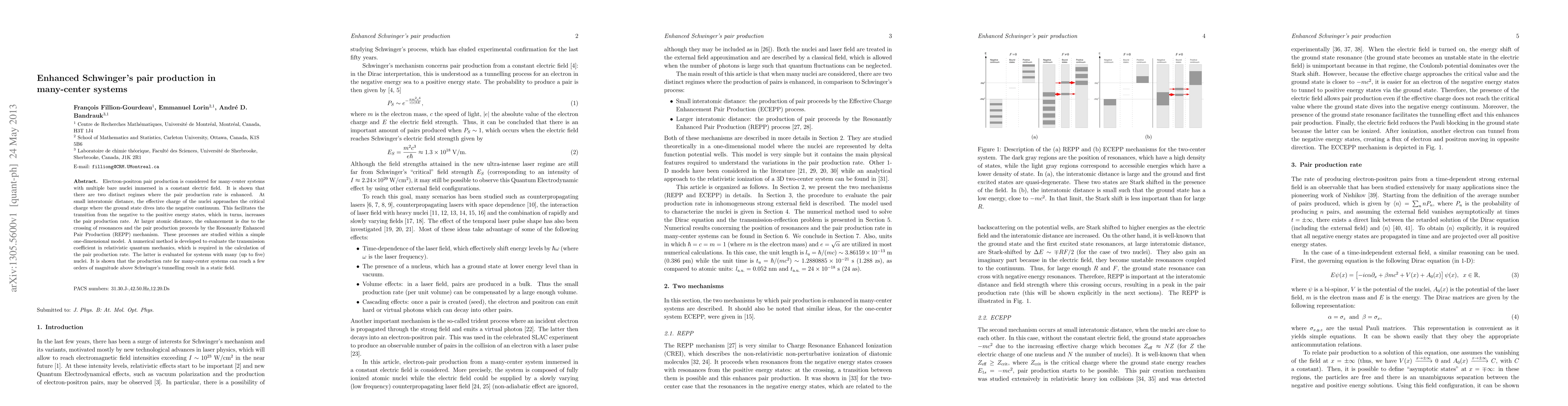 Electron-positron pair production is considered for many-center systems with multiple bare nuclei immersed in a constant electric field. It is shown that there are two distinct regimes where the pair production rate is enhanced. At small interatomic distance, the effective charge of the nuclei approaches the critical charge where the ground state dives into the negative continuum. This facilitates the transition from the negative to the positive energy states, which in turns, increases the pair production rate. At larger atomic distance, the enhancement is due to the crossing of resonances and the pair production proceeds by the Resonantly Enhanced Pair Production (REPP) mechanism. These processes are studied within a simple one-dimensional model. A numerical method is developed to evaluate the transmission coefficient in relativistic quantum mechanics, which is required in the calculation of the pair production rate. The latter is evaluated for systems with many (up to five) nuclei. It is shown that the production rate for many-center systems can reach a few orders of magnitude above Schwinger's tunnelling result in a static field.