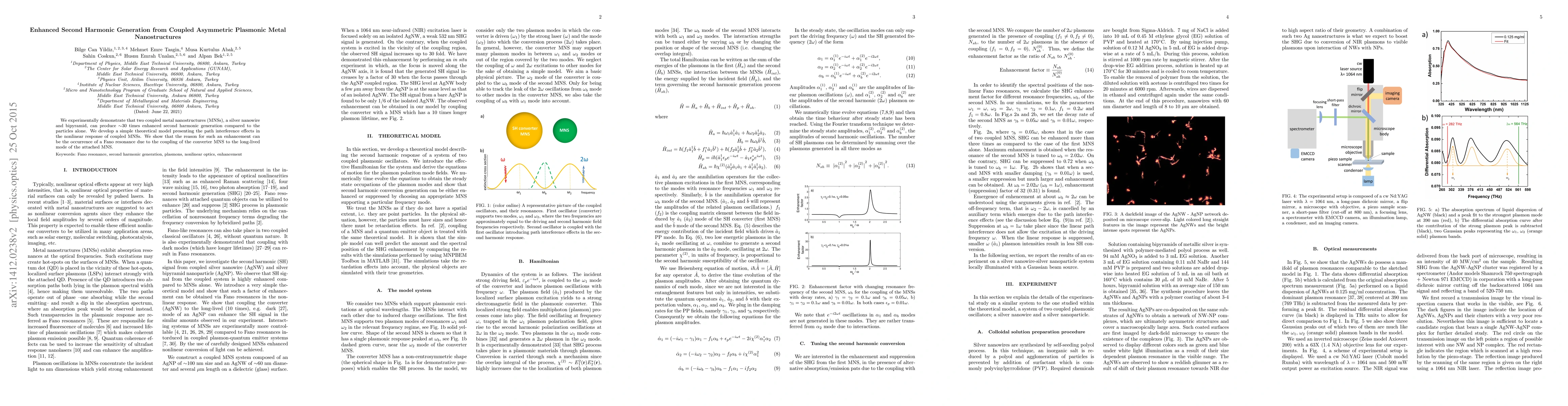 This paper demonstrates a significant enhancement in second harmonic generation (SHG) through Fano resonant coupling in asymmetric plasmonic metal nanostructures. Theoretical and experimental results show that coupling a single metal nanostructure with another having a higher quality factor can boost SHG efficiency by approximately 30 times.