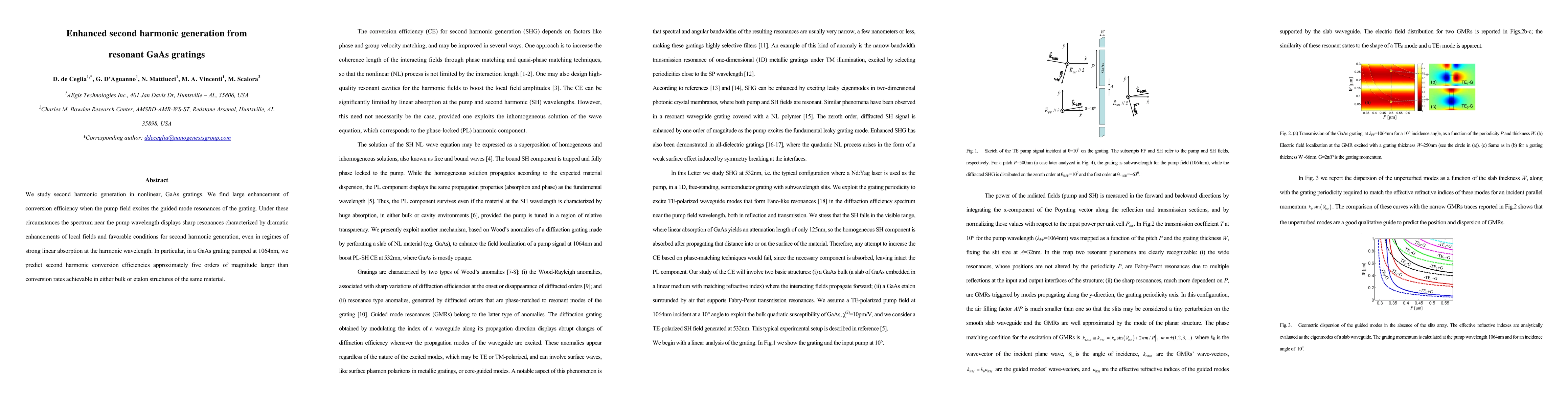 This study investigates second harmonic generation in nonlinear GaAs gratings, revealing significant efficiency enhancements through guided mode resonances. The research predicts conversion efficiencies five orders of magnitude higher than bulk or etalon structures, particularly when pumped at 1064nm.