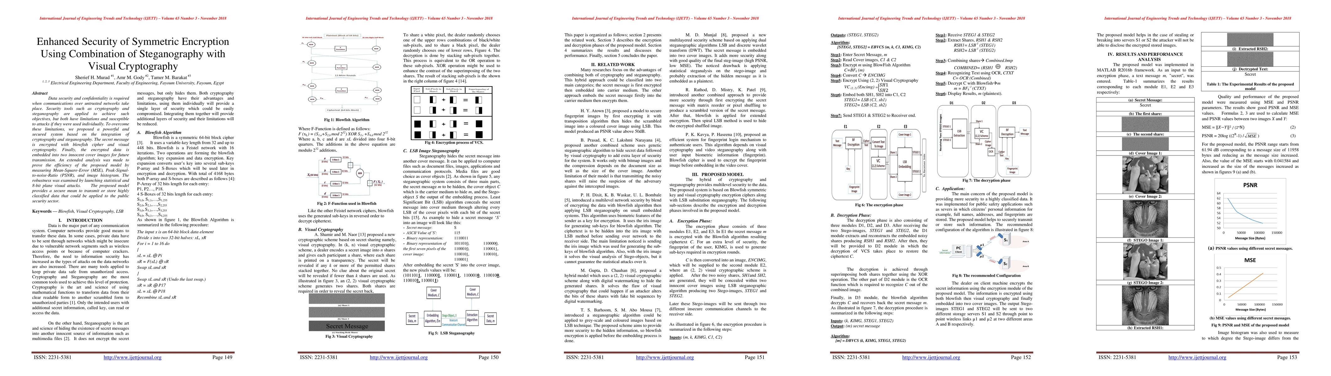 Data security is required when communications over untrusted networks takes place. Security tools such as cryptography and steganography are applied to achieve such objectives, but both have limitations and susceptible to attacks if they were used individually. To overcome these limitations, we proposed a powerful and secured system based on the integration of cryptography and steganography. The secret message is encrypted with blowfish cipher and visual cryptography. Finally, the encrypted data is embedded into two innocent cover images for future transmission. An extended analysis was made to prove the efficiency of the proposed model by measuring Mean-Square-Error (MSE), Peak-Signal-to-noise-Ratio (PSNR), and image histogram. The robustness was examined by launching statistical and 8-bit plane visual attacks. The proposed model provides a secure mean to transmit or store highly classified data that could be applied to the public security sector.