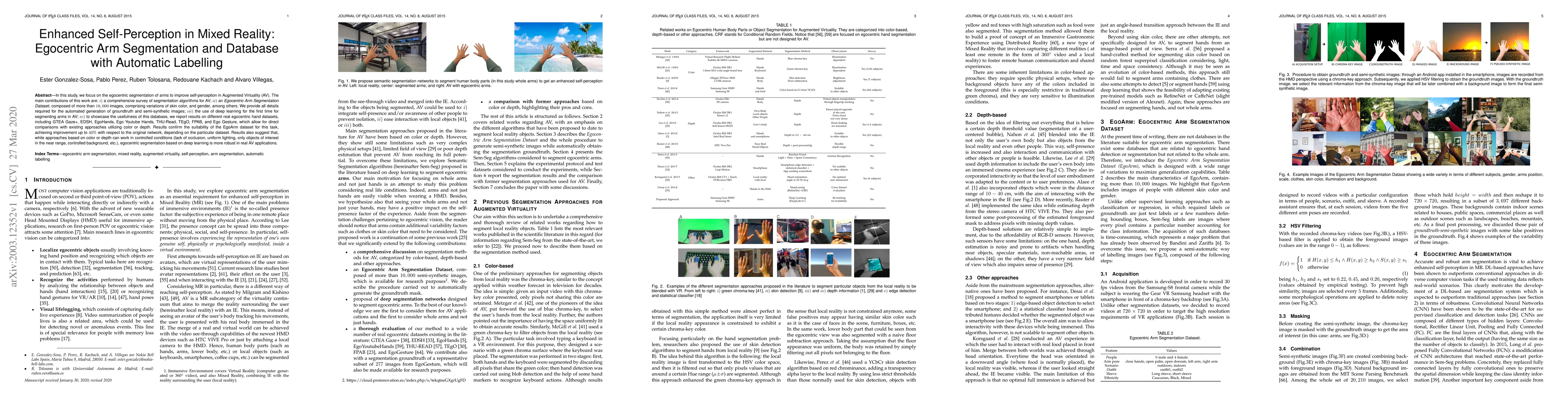 This study presents an Egocentric Arm Segmentation Dataset for augmented virtuality, employing deep learning for the first time to segment arms. The dataset, comprising over 10,000 images, supports automated groundtruth generation and demonstrates significant improvements in self-perception tasks compared to traditional color or depth-based methods.