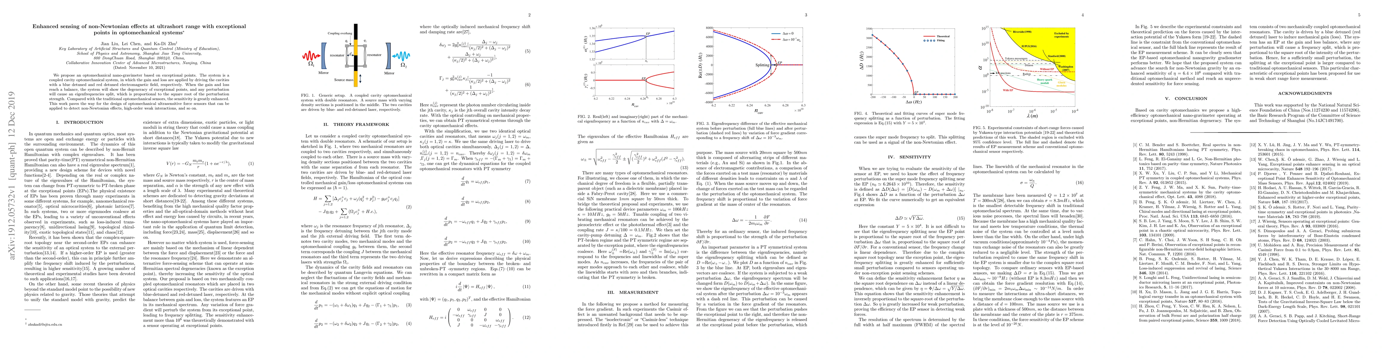 This paper proposes an optomechanical nano-gravimeter based on exceptional points to enhance sensing of non-Newtonian effects at ultrashort ranges. The system's sensitivity is significantly improved due to the eigenfrequency split proportional to the square root of perturbation strength, paving the way for ultrasensitive force sensors.