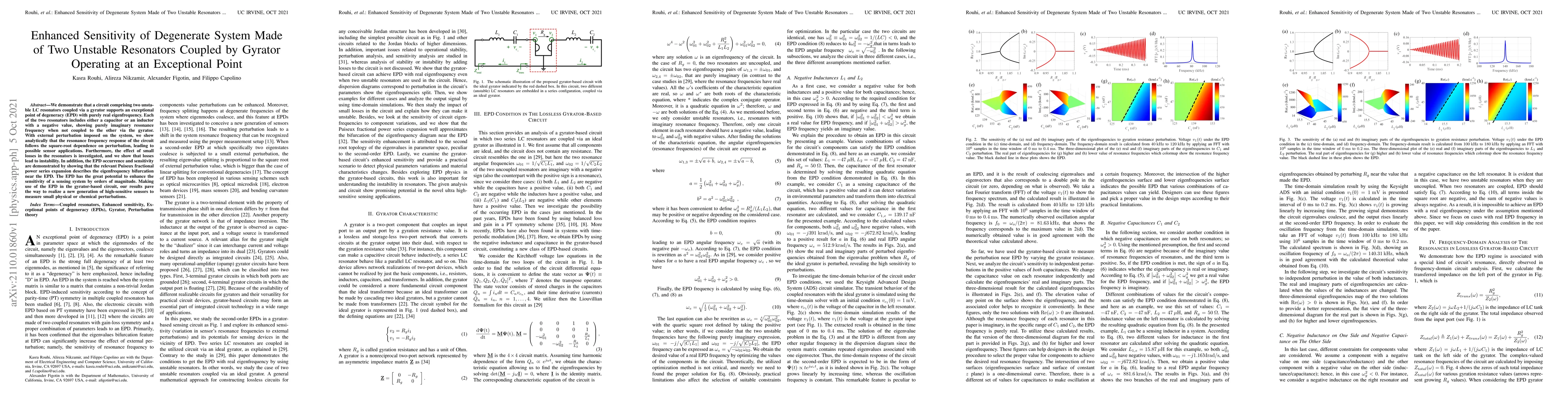 A circuit of two unstable LC resonators coupled via a gyrator achieves a degenerate system with a purely real eigenfrequency, enhancing sensitivity for sensing small physical or chemical perturbations.