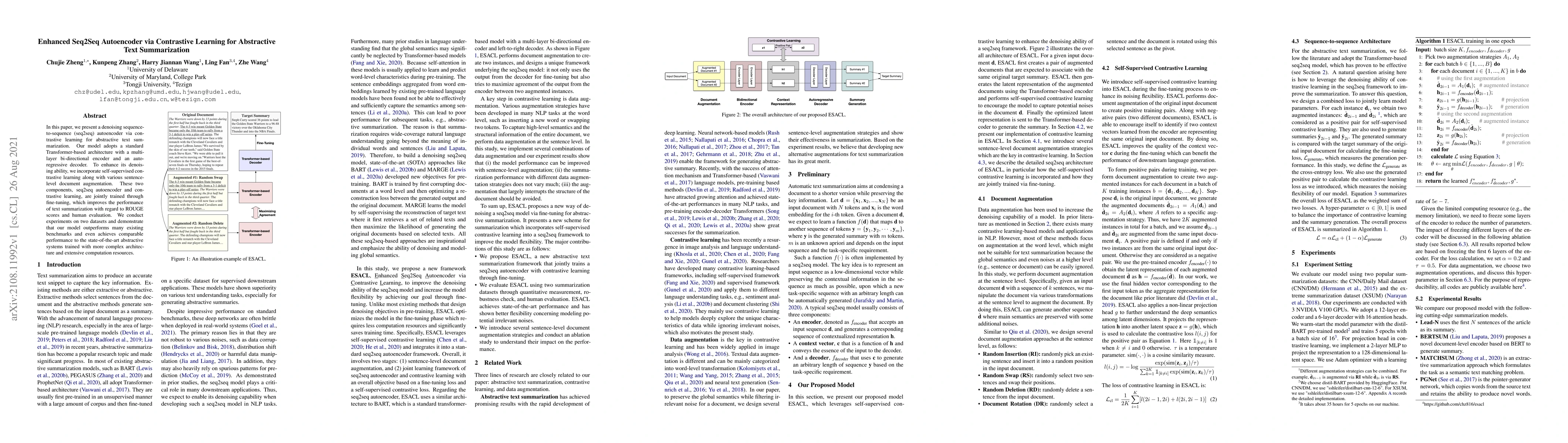 This paper proposes a denoising seq2seq autoencoder enhanced by contrastive learning for abstractive text summarization, achieving superior ROUGE scores and human evaluation over existing benchmarks, even rivaling state-of-the-art models.