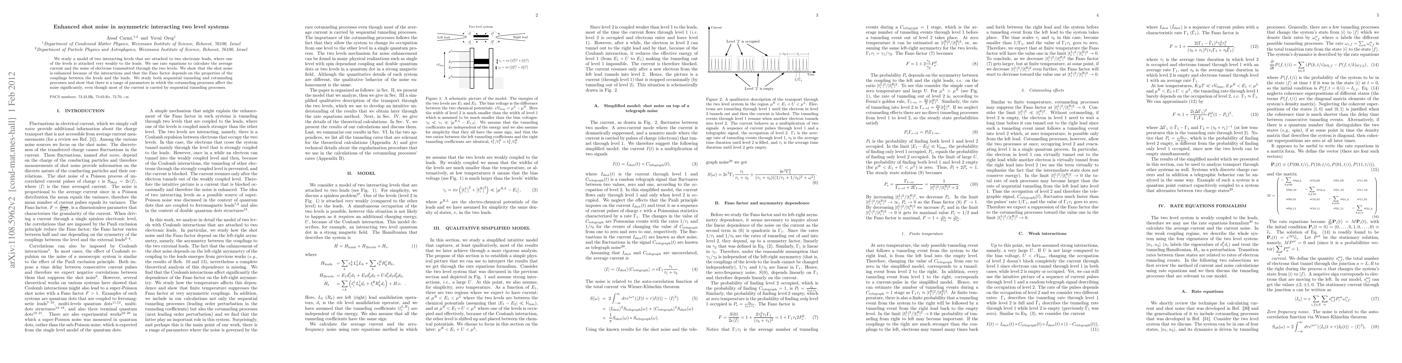 This paper investigates enhanced shot noise in asymmetric interacting two-level systems connected to electronic leads, revealing that interactions boost noise levels. The Fano factor's dependence on coupling properties is demonstrated, with cotunneling processes significantly affecting noise despite sequential tunneling dominating current.